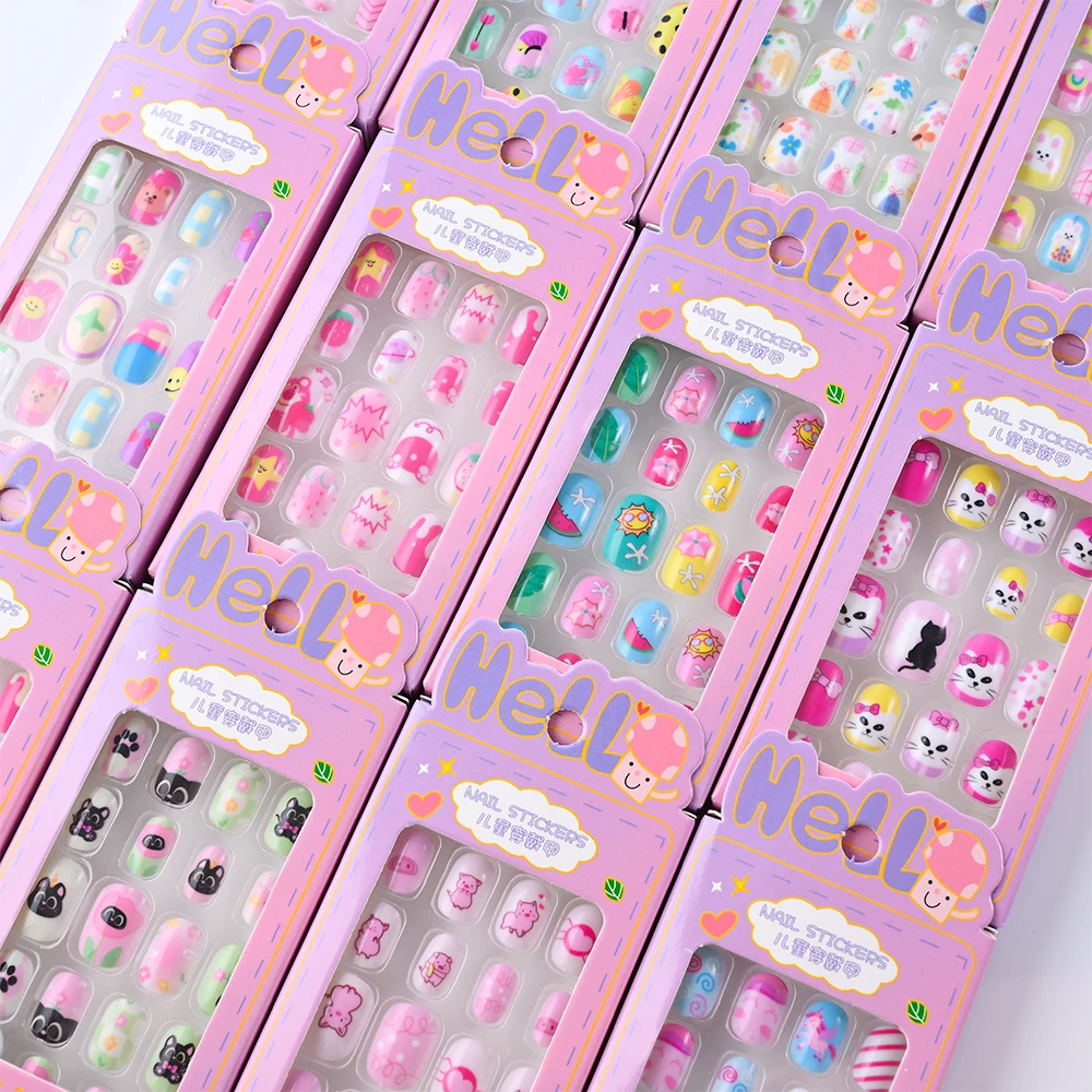 24 قطعة/صندوق الاطفال الأظافر لفتاة الكرتون نمط أظافر صناعية لطيف الطفل الأظافر وهمية نصائح Kawaii الاكريليك الصحافة الاصطناعية على مسمار + أداة
