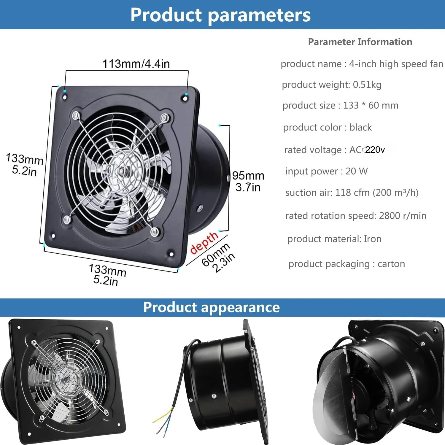 4/6/8 "مروحة العادم معدنية تهوية الحديد النازع ، الصمت مع صمام فحص مضاد للتدفق الخلفي نافذة ومراوح تنفيس جدار جبل للمنزل