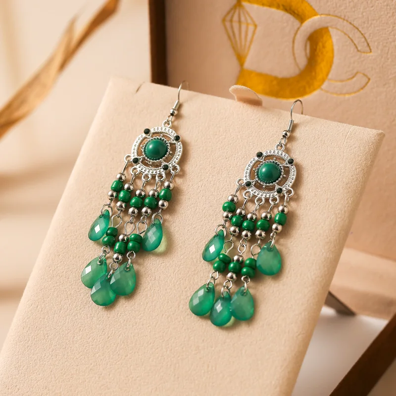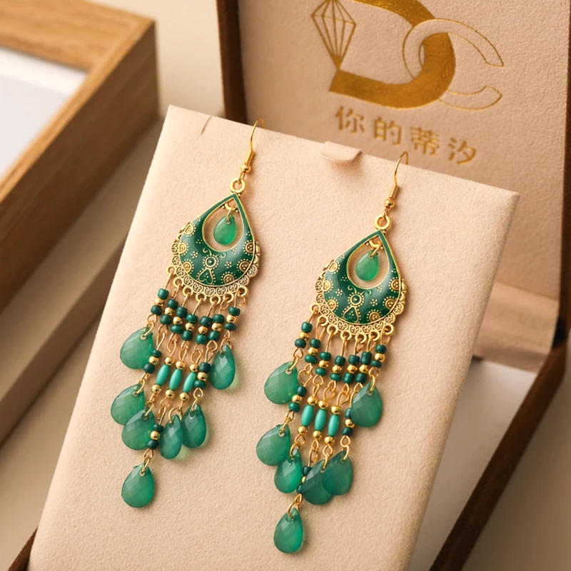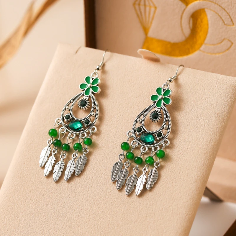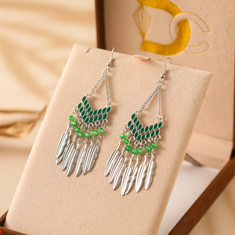 البوهيمي الأخضر المينا ليف قطرة الماء أقراط للنساء العرقية طويلة هندسية الطازجة القرط الإناث عطلة اليومية مجوهرات هدية
