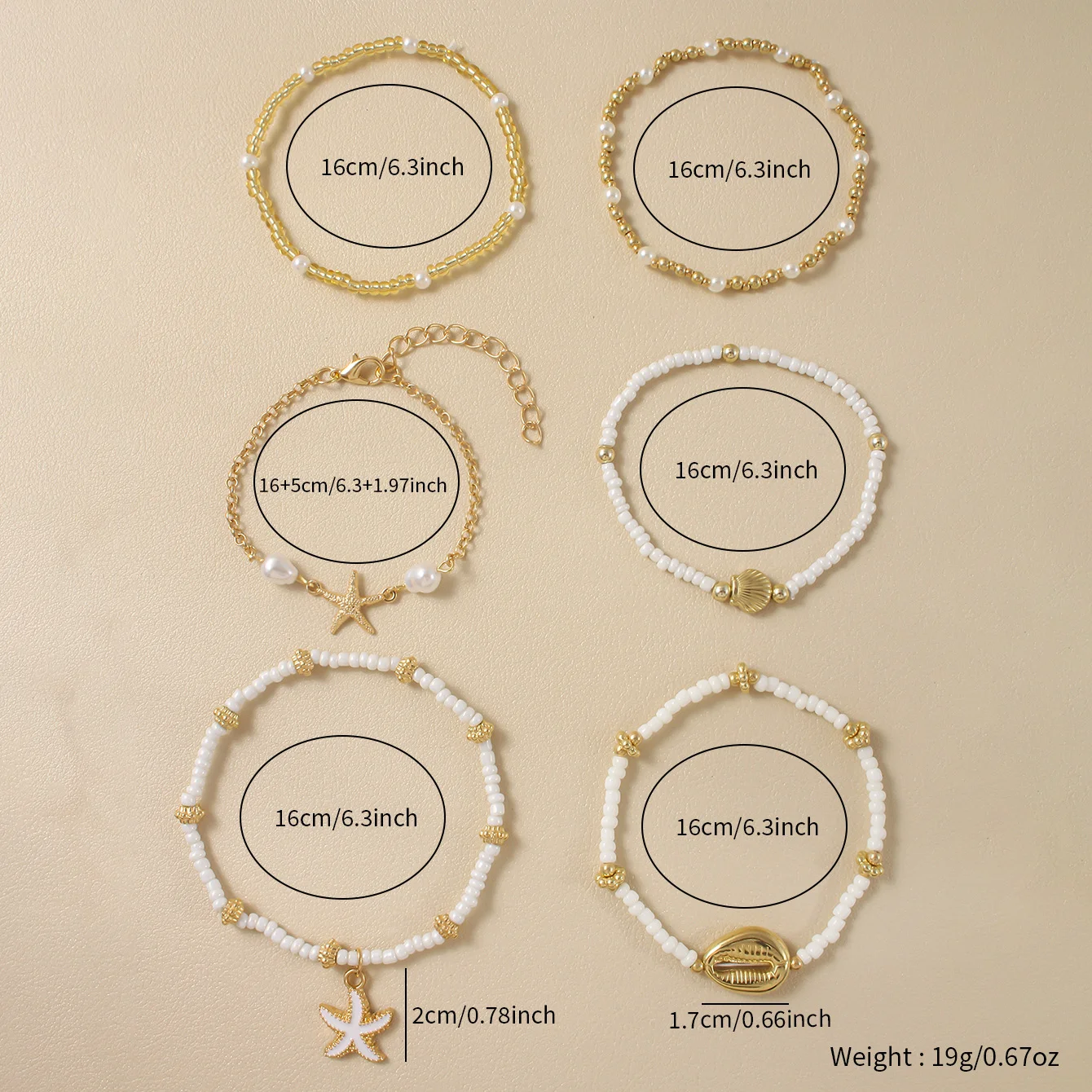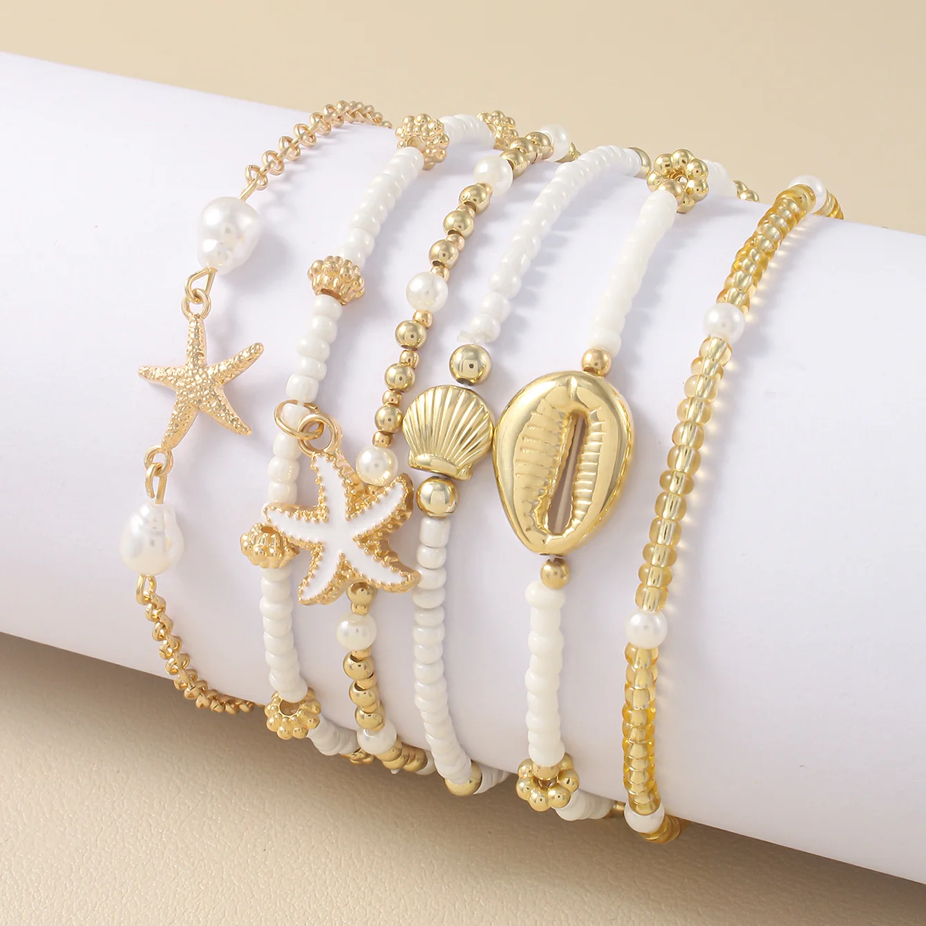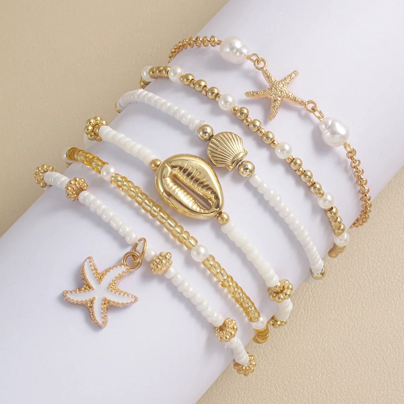 البوهيمي شل نجم البحر حبة سوار مجموعة للنساء أزياء الصيف الشاطئ متعدد الطبقات مكدسة أساور اللؤلؤ هدايا مجوهرات الحفلات