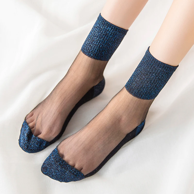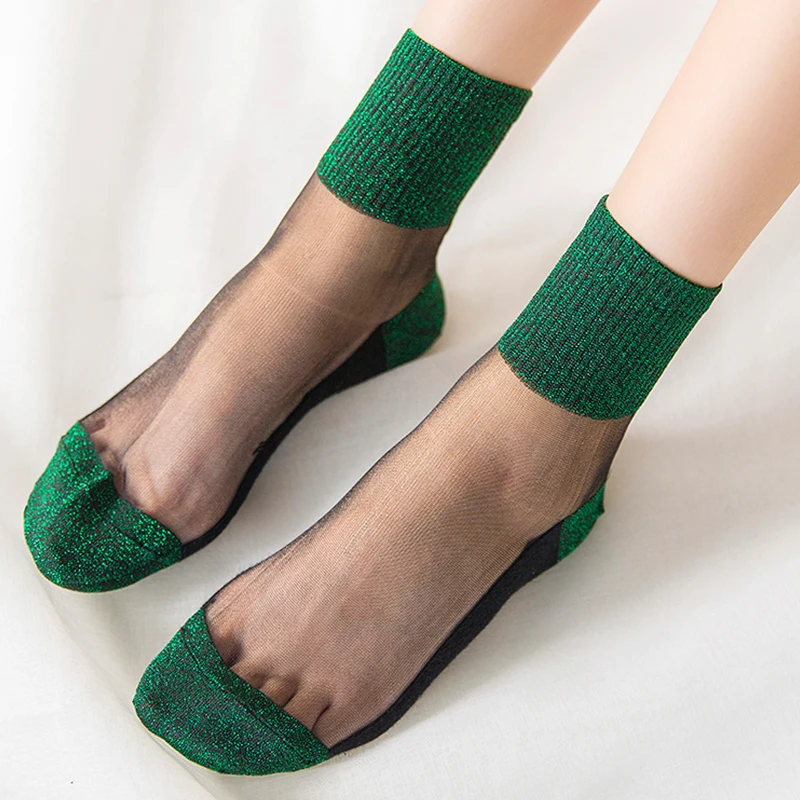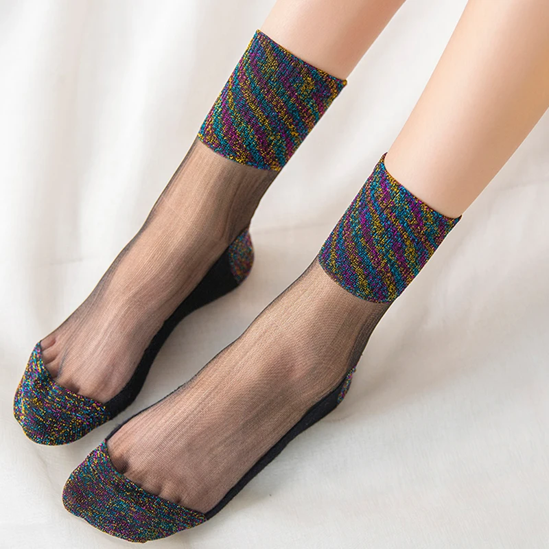 المرأة الصيف بريق الحرير رقيقة الجوارب سيدة الدانتيل شبكة لامعة الجوارب المرنة خليط الألوان كريستال شفافة الكاحل الجوارب Meias