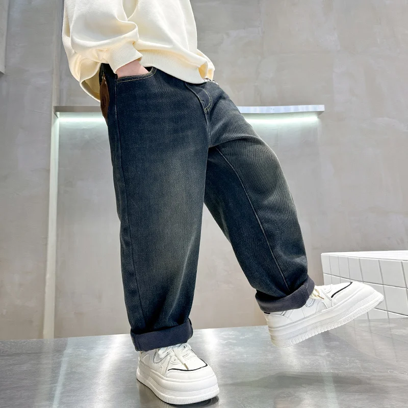 الرجعية الأزرق الداكن الشتاء الجينز الدافئة للمراهقين الصبي الكلاسيكية سميكة معزول الدينيم السراويل الطفل الجينز الحراري بنطلون للأطفال