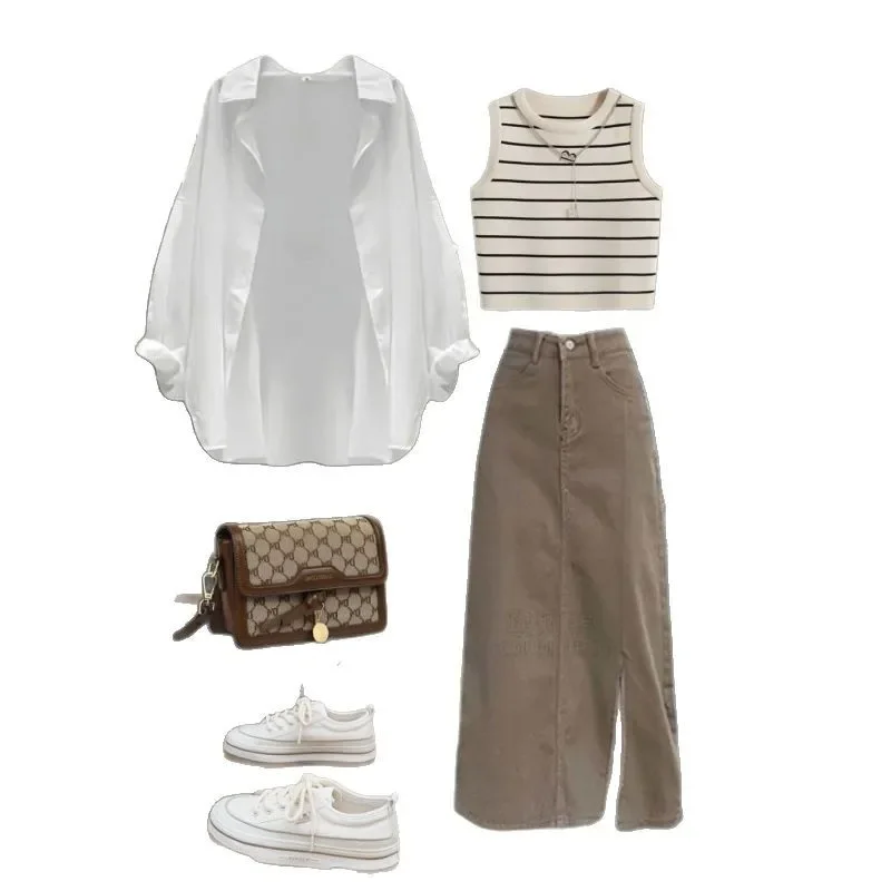 الصيف لطيف نمط المرأة تخفيف قميص سترة مخطط نصف طول تنورة ثلاث قطع مجموعة النسخة الكورية الزي المألوف