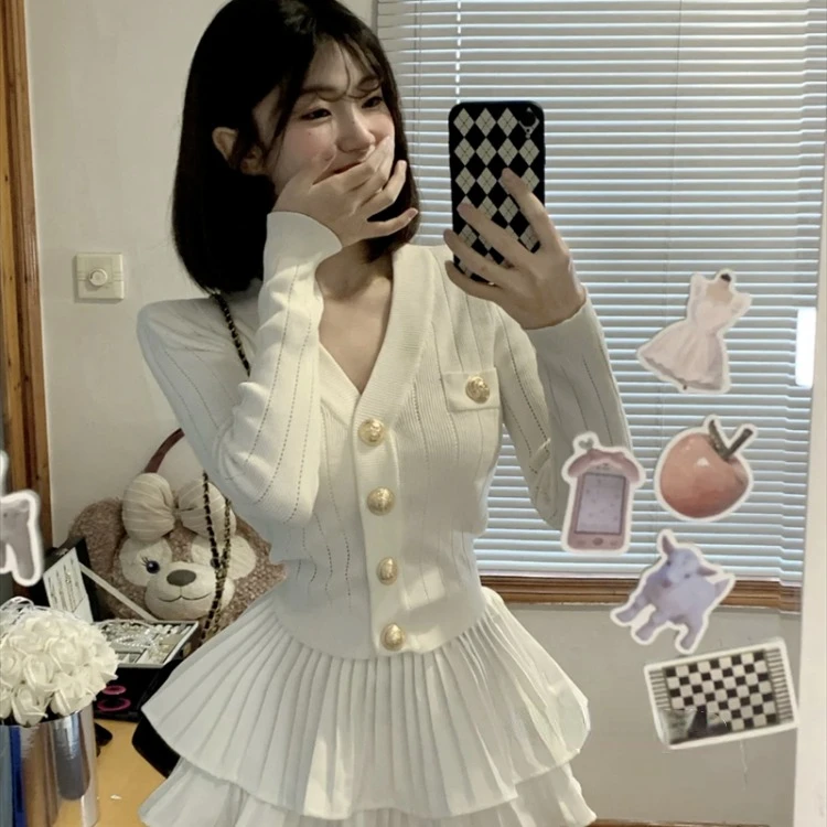 أنيقة الحلو الخامس الرقبة سليم صالح محبوك القمم النساء Y2k E-Girl عالية الخصر Ruched كعكة التنانير 2025 الخريف جديد قطعتين مجموعات