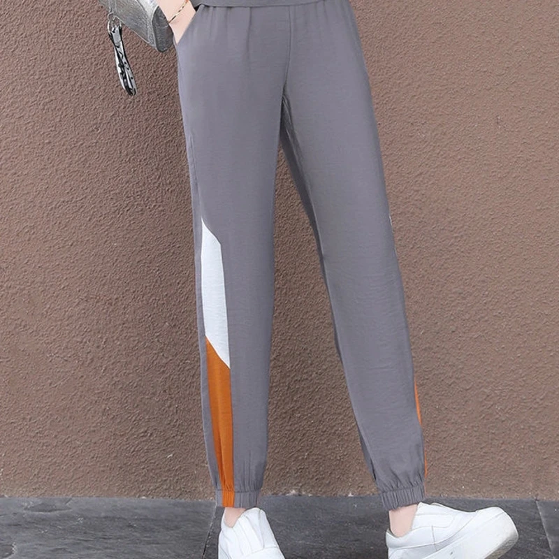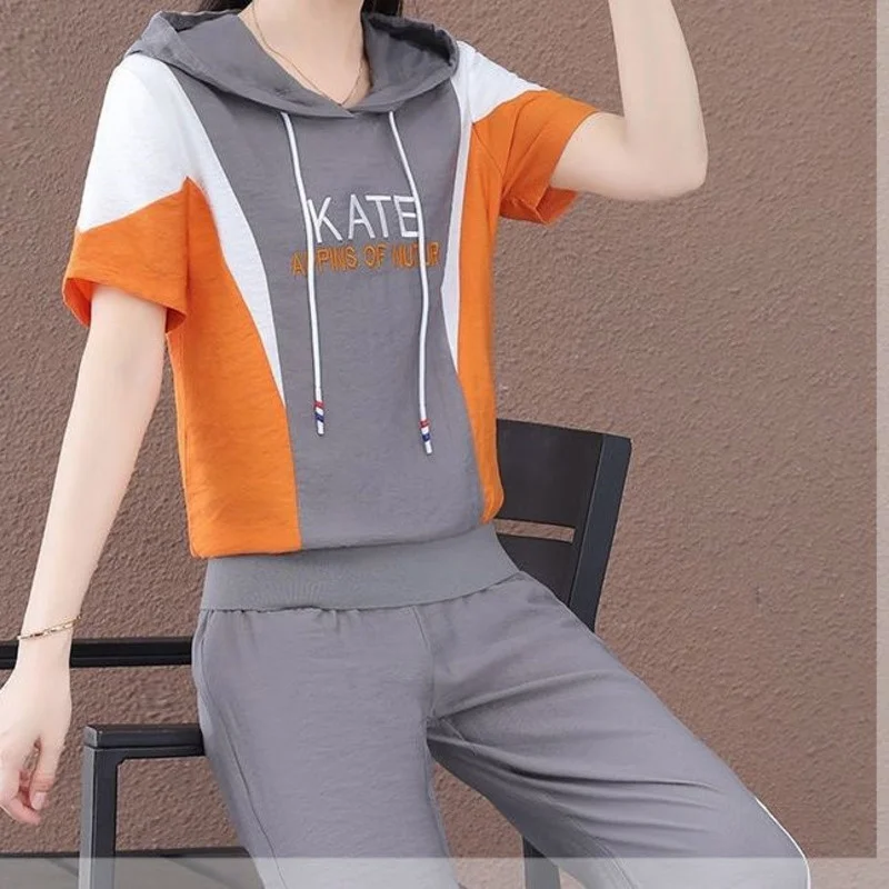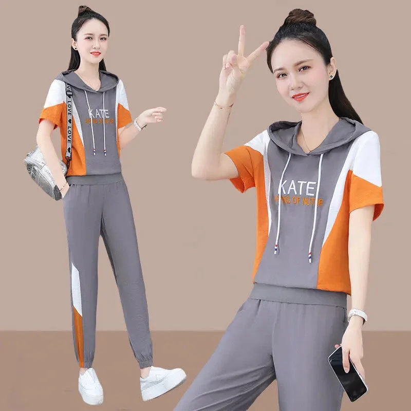 بدلة رياضية نسائية موضة 2025 لربيع وصيف جديد طقم مكون من قطعتين مع قلنسوة وأكمام قصيرة بلوزات وسراويل ملابس كورية بمقاسات كبيرة