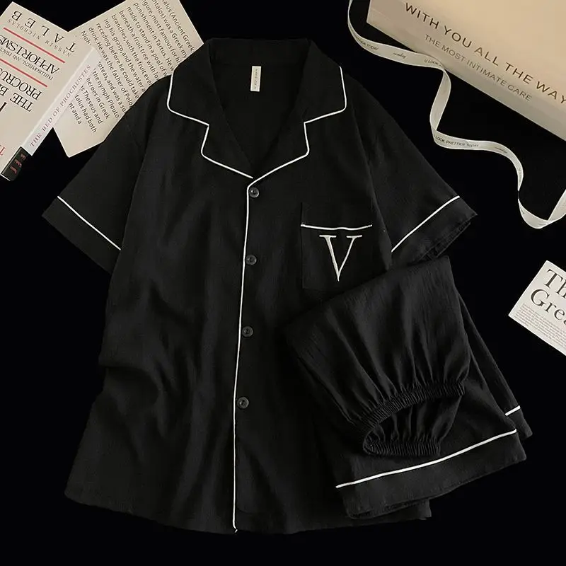 بيجامة رجالية كبيرة من غزل القطن الخالص للربيع والخريف بأكمام طويلة ملابس خارجية سوداء بسيطة طقم ملابس منزلية صيفي
