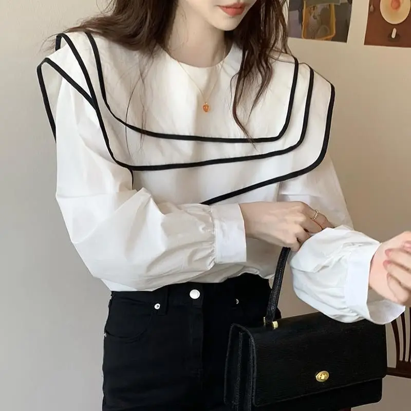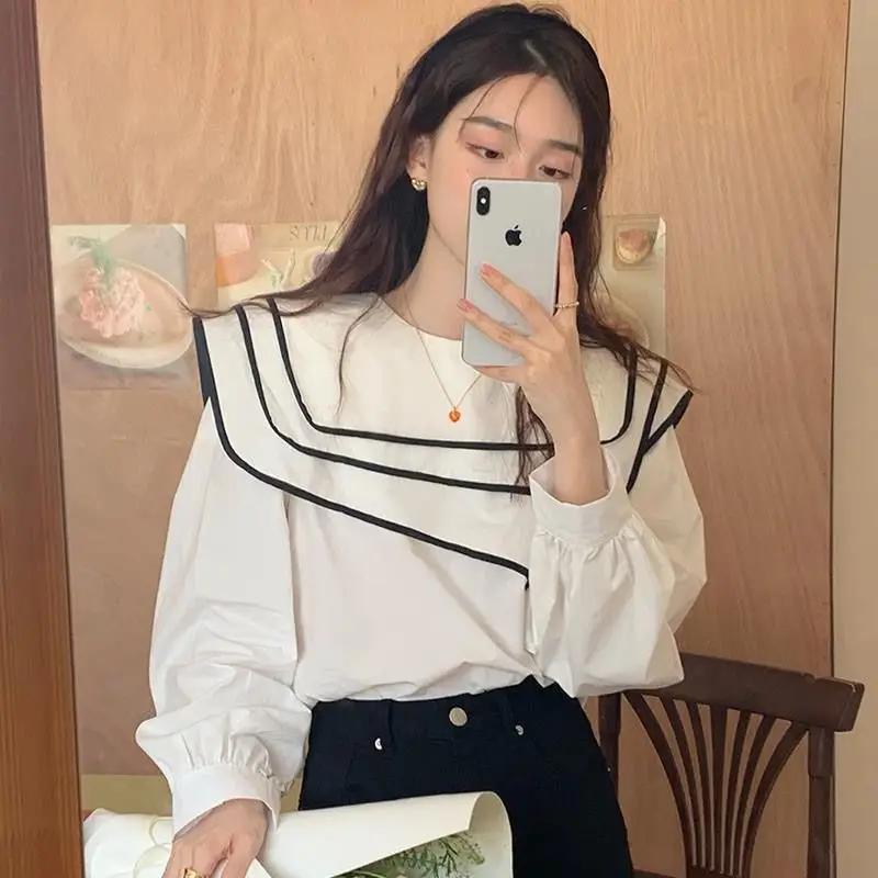 فام الكورية المرقعة بدوره إلى أسفل طوق بلوزة طويلة الأكمام الخريف البساطة كل مباراة قمصان فضفاضة ملابس حريمي الاتجاه الأعلى المحملة