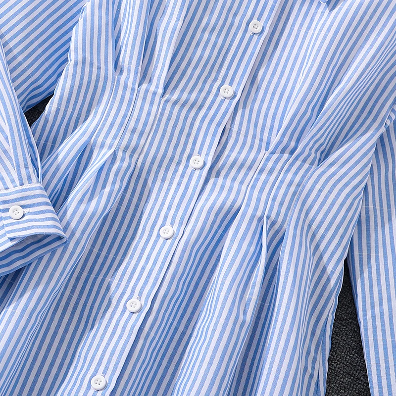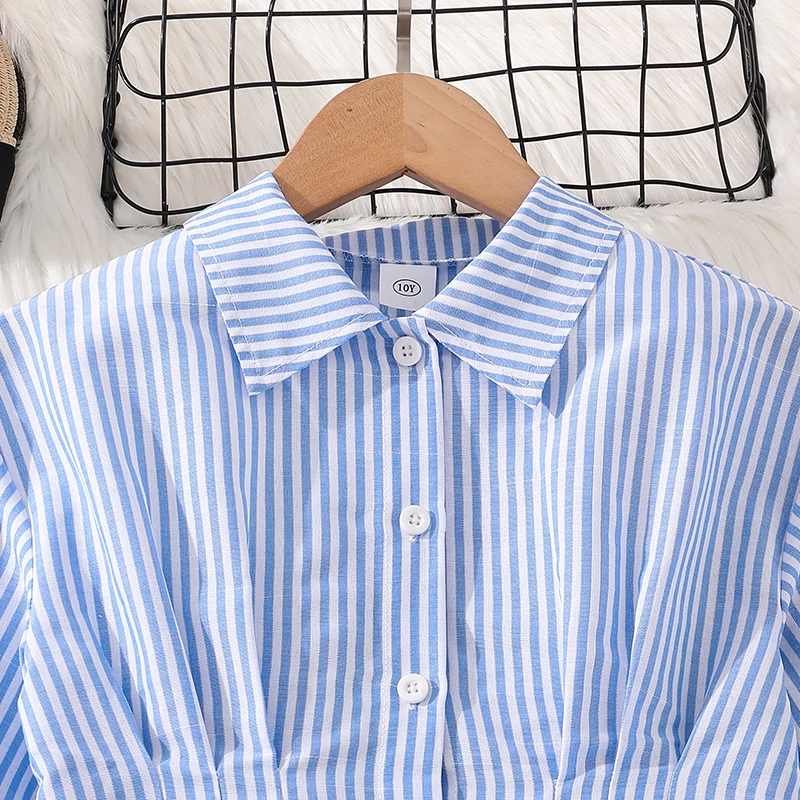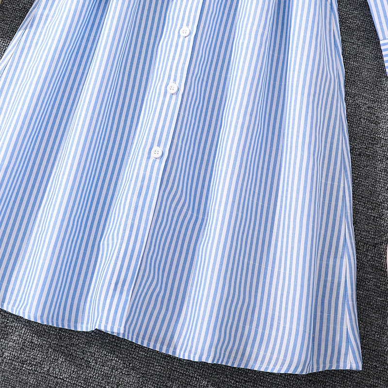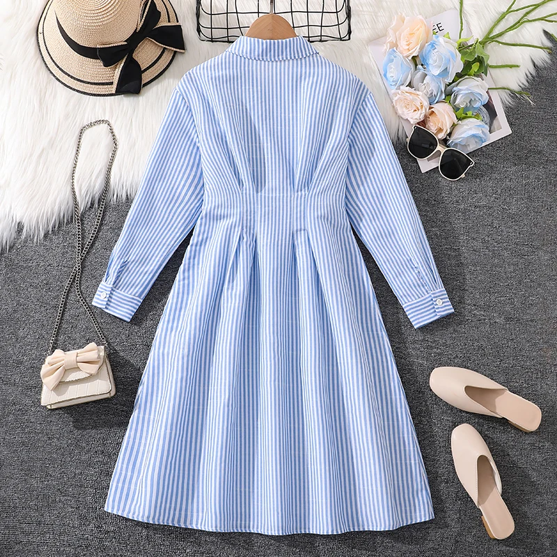 فستان الربيع والخريف للفتيات بعمر 8-12 سنة، ياقة قميص مخططة باللونين الأزرق والأبيض، فستان طويل أنيق يشبه اليومي