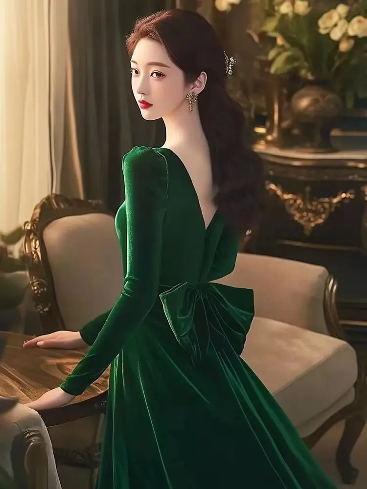 فستان أنيق عالي الجودة لخريف وشتاء 2025 للسيدات، تنورة طويلة بتصميم فيونكة مخملية ذهبية جميلة