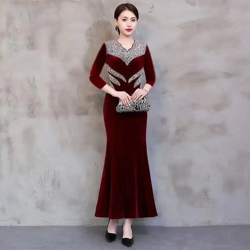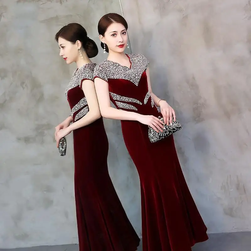 فستان نسائي بأكمام قصيرة على شكل حرف V ، فساتين خفيفة ، قطيفة ذهبية ماسية ، شيونغسام ، الربيع ، الخريف ، ملابس موضة جديدة ،