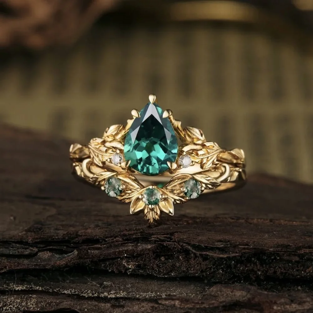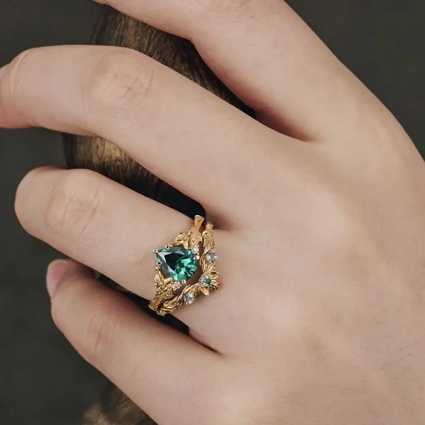 جديد الموضة الأوروبية الأمريكية الأخضر قطرة الماء الزركون خاتم مطلية بالذهب مطلي مع أزواج الماس الأخضر للنساء خاتم بالجملة