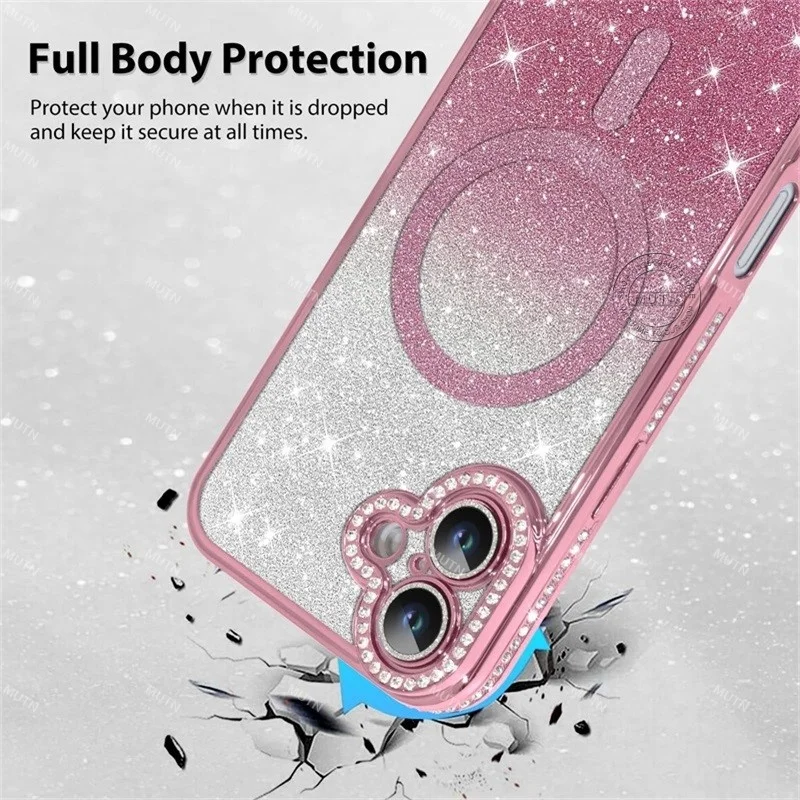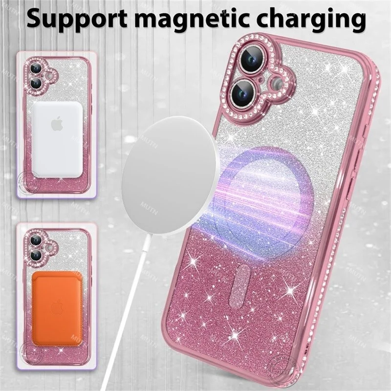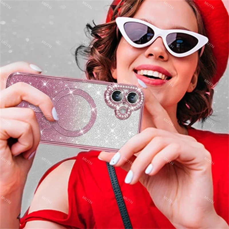 غطاء خلفي مغناطيسي لامع لامع لهاتف آيفون 17 اير 16 برو ماكس 11 12 13 14 15 بلس حافظة ماسية Magsafe للفتيات والنساء