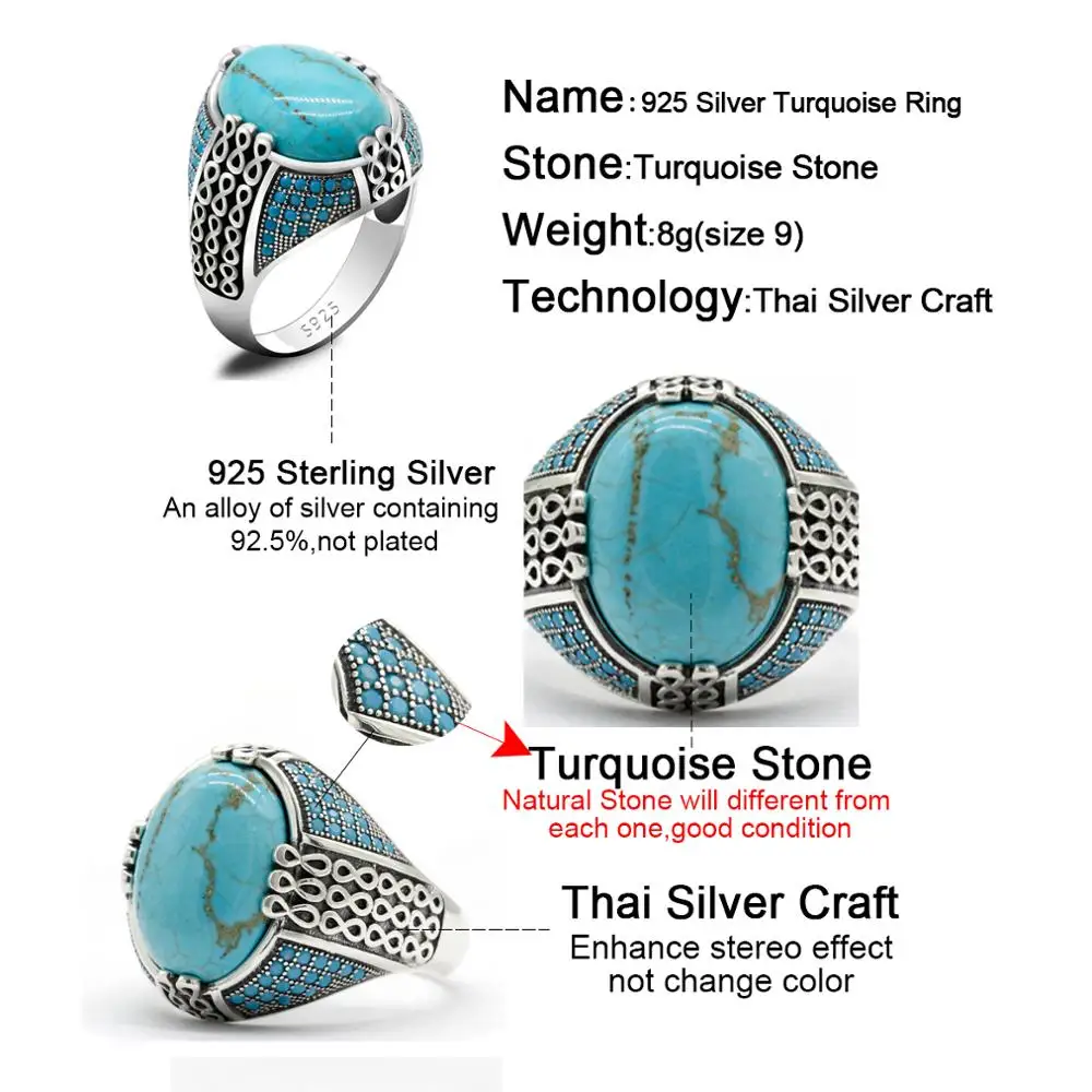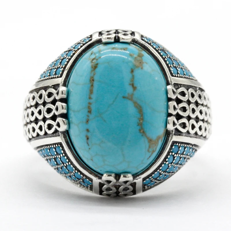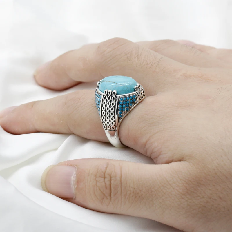 خاتم من الفضة الإسترليني عيار 925 مرصع بحجر الفيروز الطبيعي ، خاتم على الطراز التركي العتيق للرجال والنساء