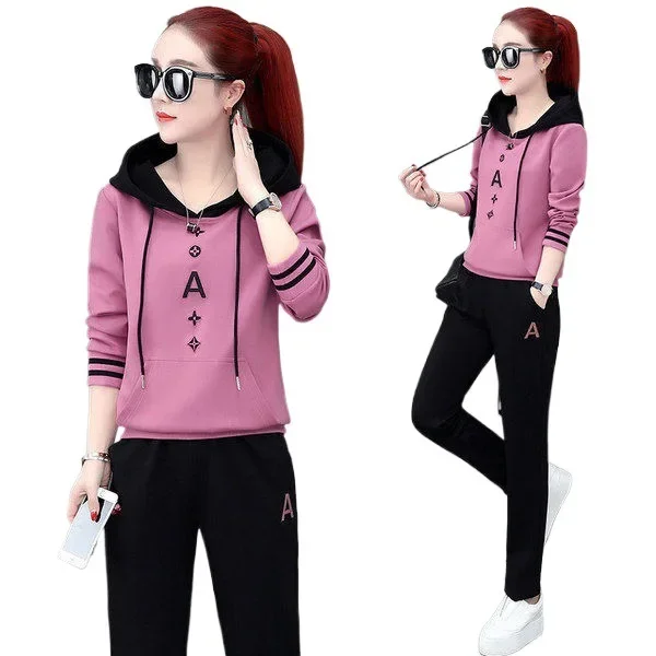 خريف جديد أزياء المرأة مقنعين البلوز طويلة الأكمام عارضة الرياضة فضفاضة تناسب 2 قطعة مجموعة الأسود