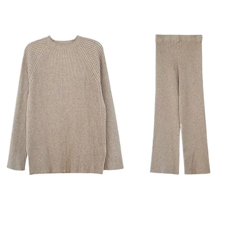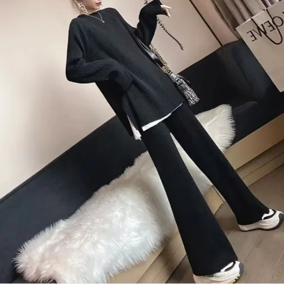 خريف موضة جديدة وصول هونج كونج نمط محبوك سترة بنطال ذو قصة أرجل واسعة المرأة الرجعية قطعتين مجموعة أنيقة أنيقة