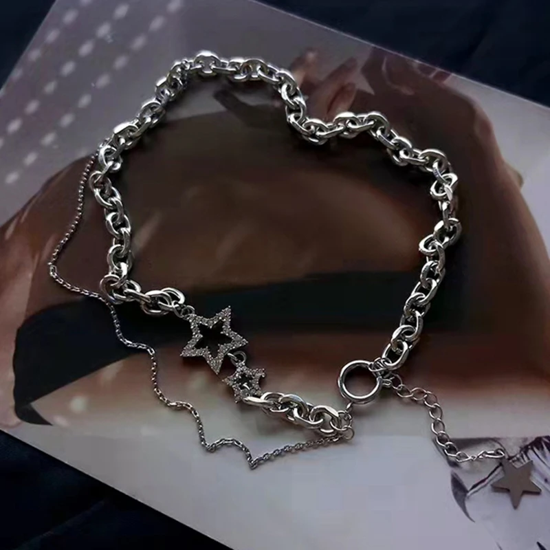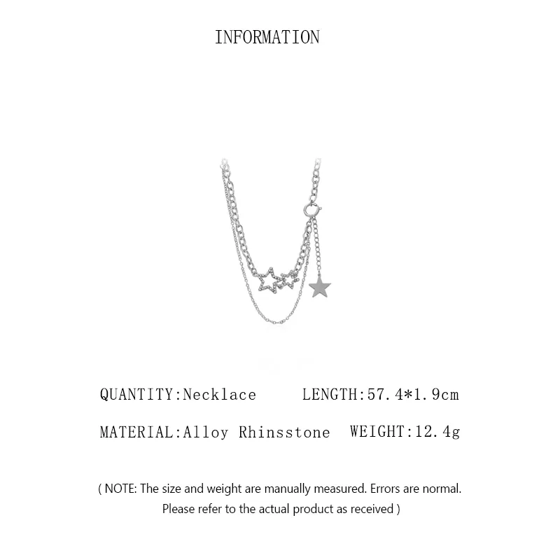 قلادة عنق نجمة مزدوجة الطبقة للرجال والنساء ، حجر الراين مرصع شخصيًا ، سلسلة ترقوة مجوفة ، لون فضي