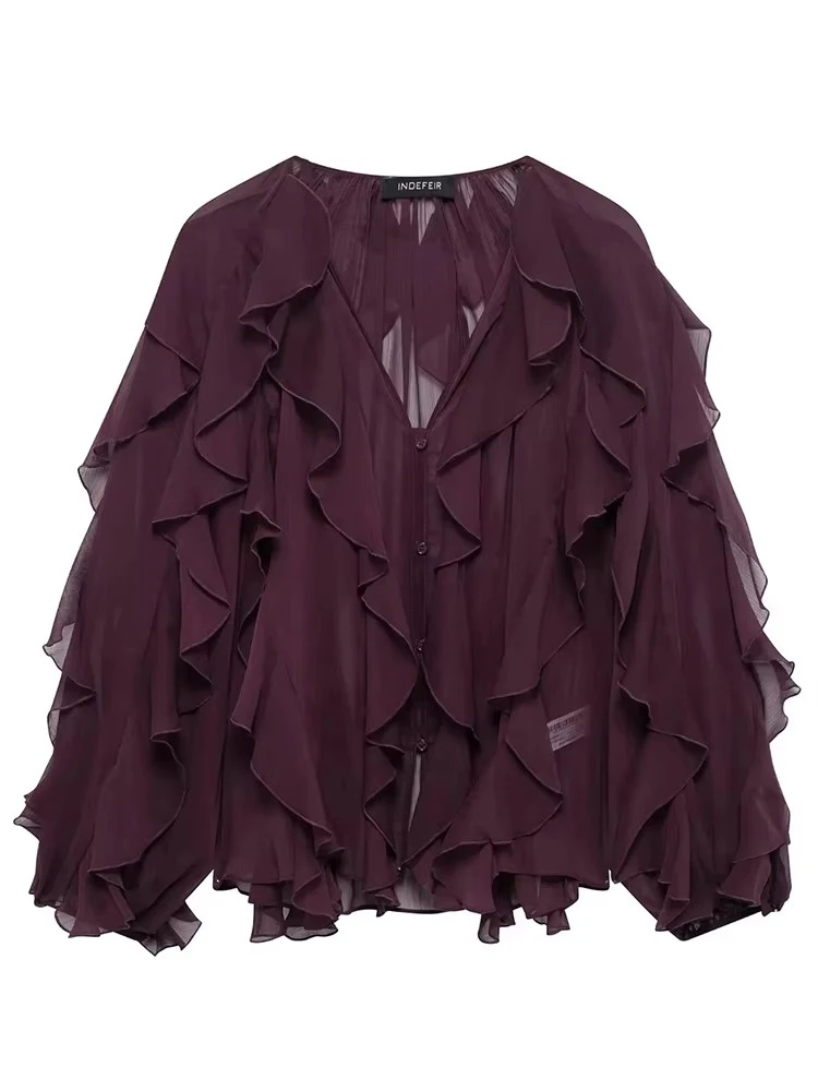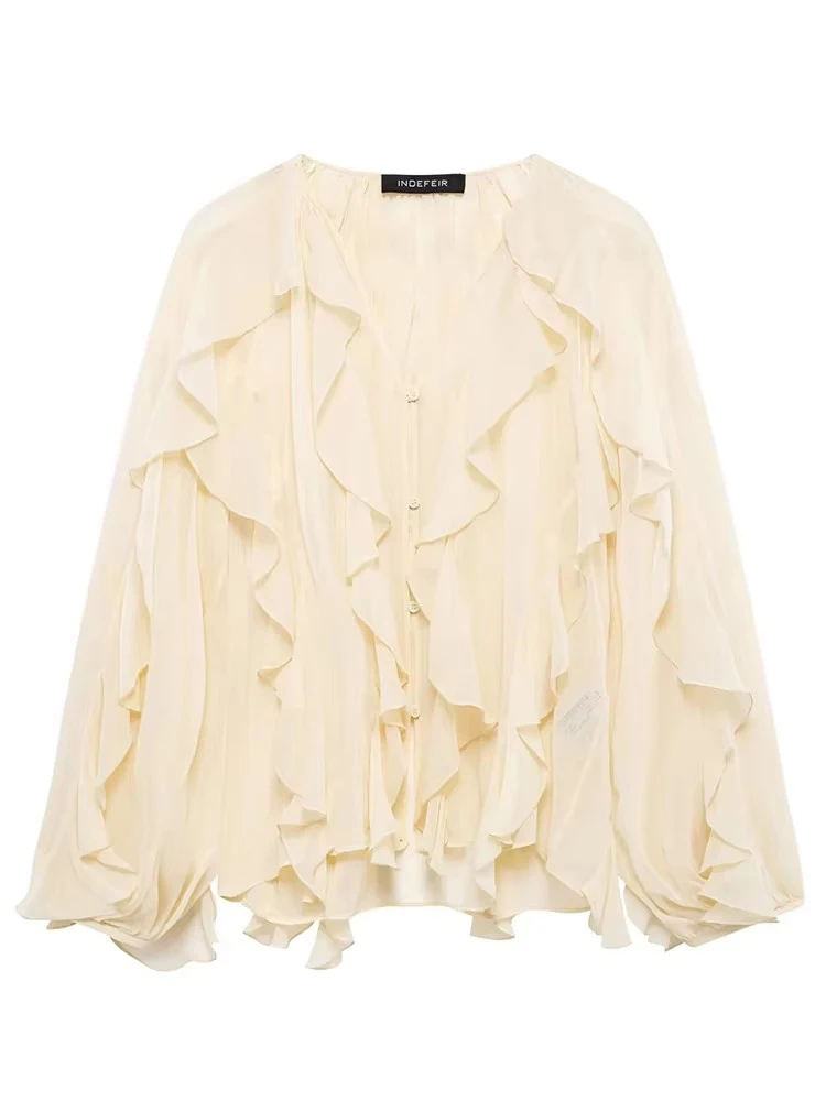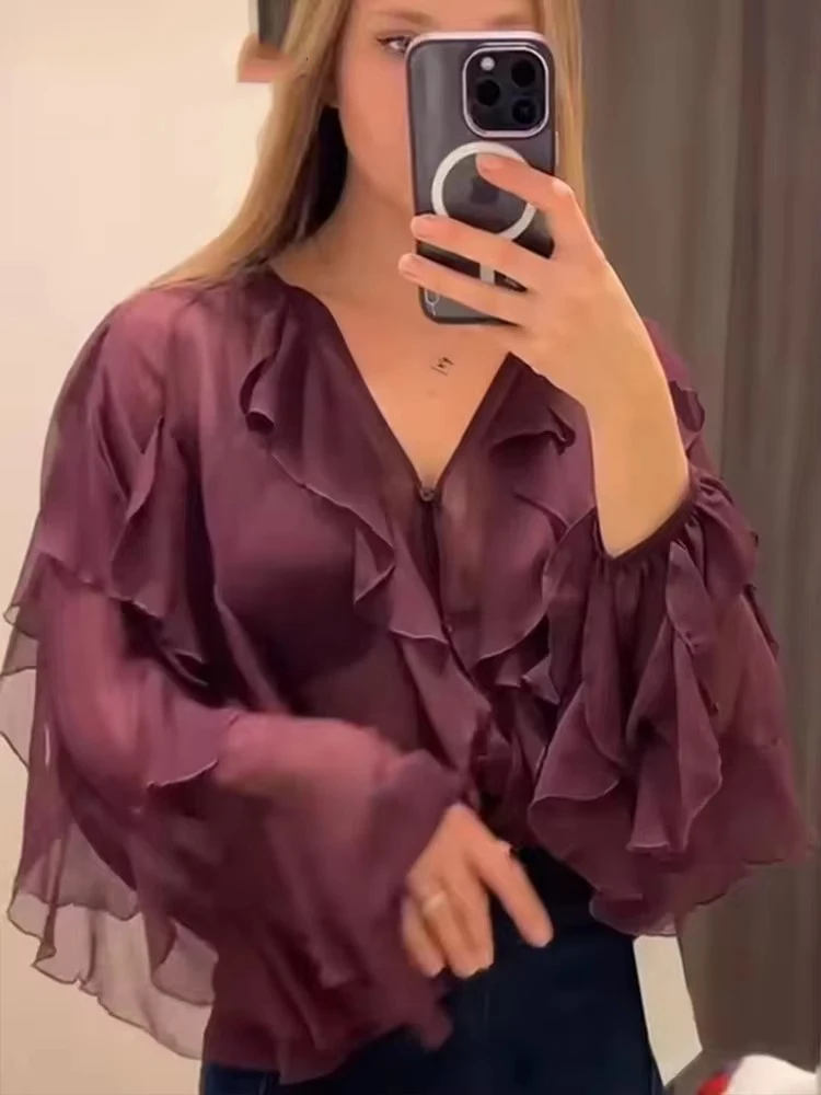قمصان وبلوزات أنيقة مكشكشة أنيقة للنساء 2025 بلوزات شبه شفافة بأكمام طويلة للنساء قميص ربيعي وبلوزة