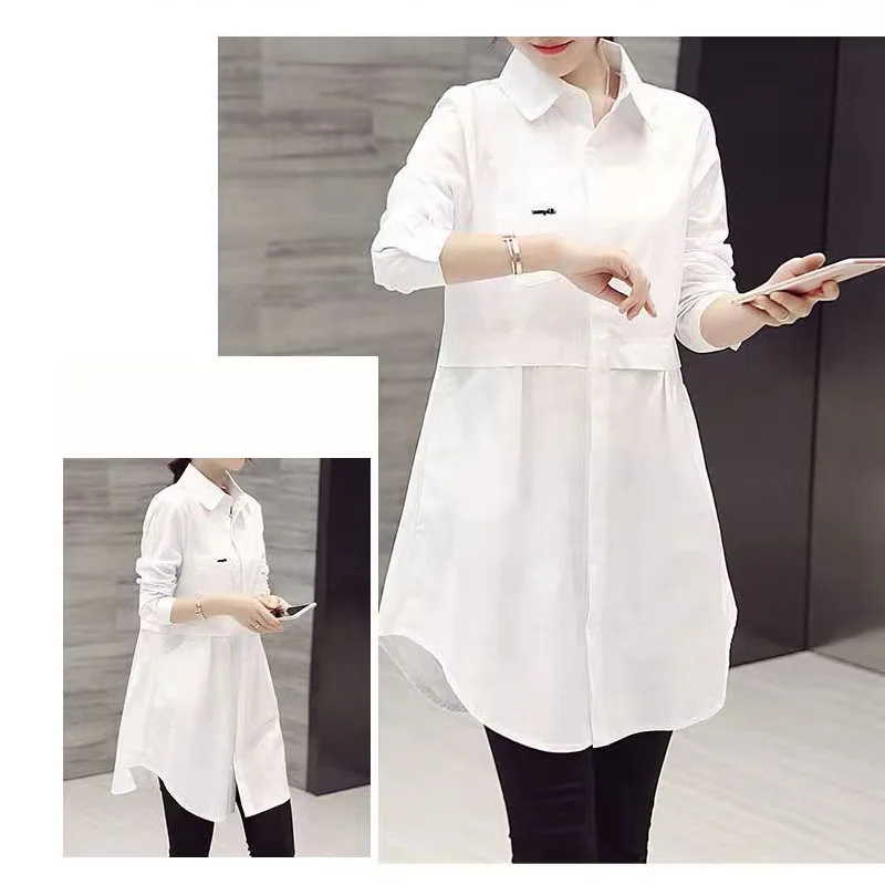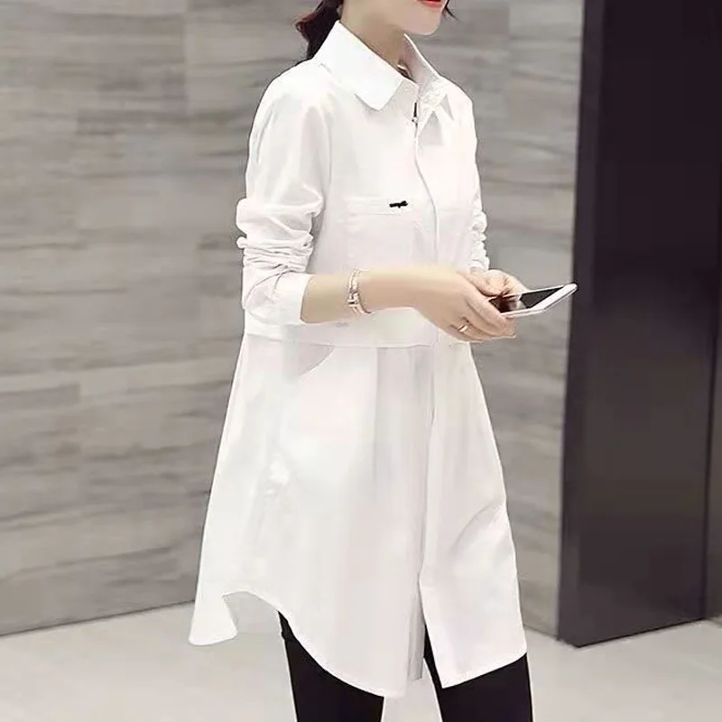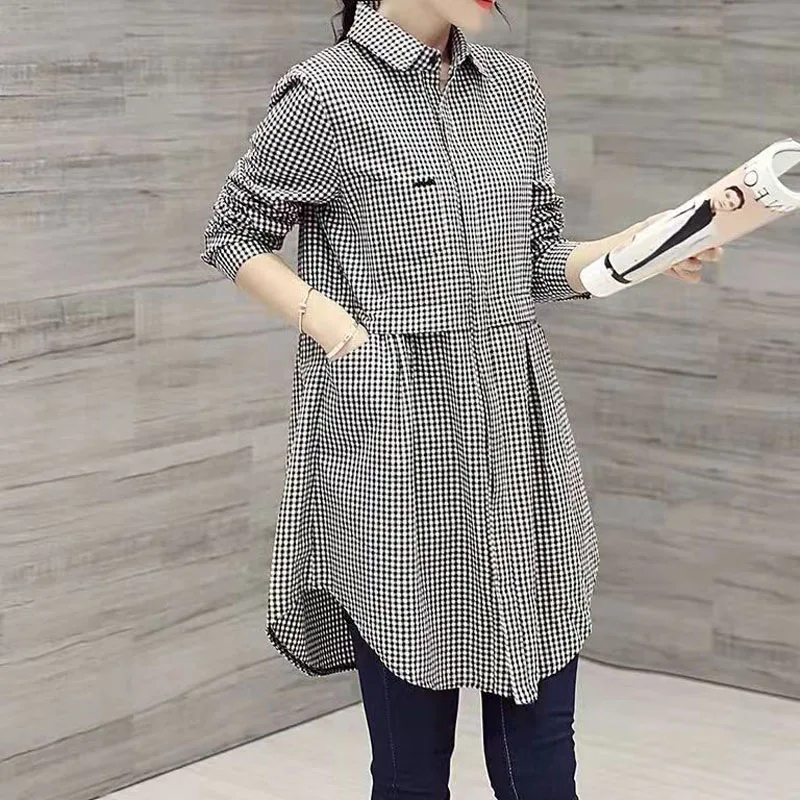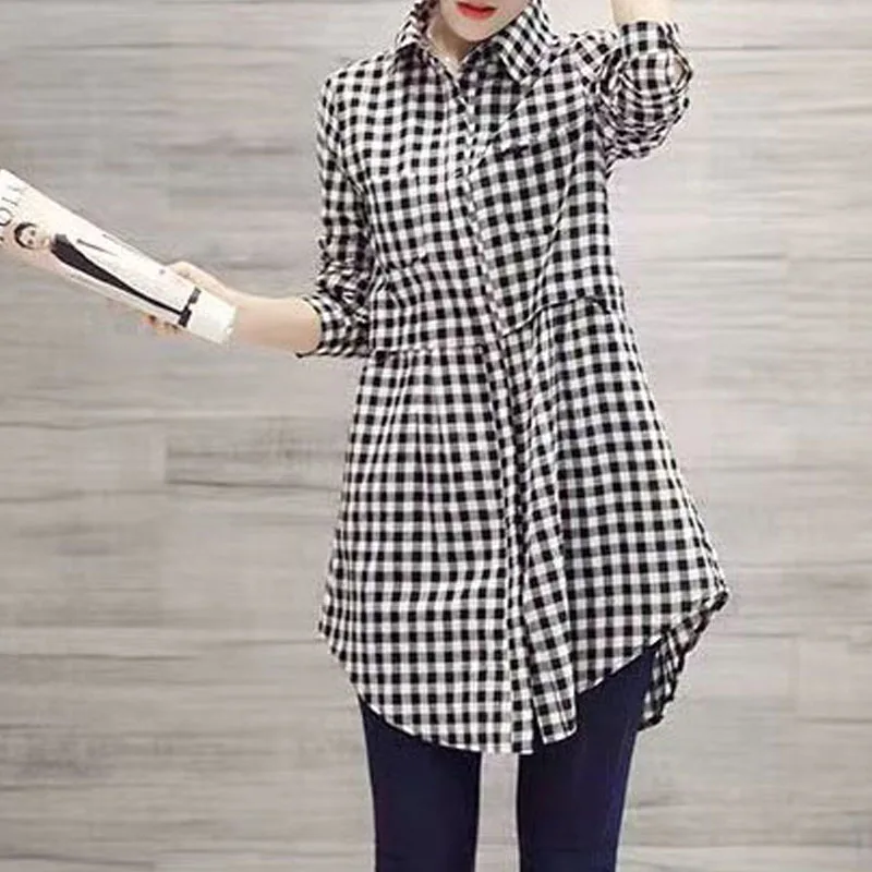 قميص نسائي منقوش بتصميم عصري كبير الحجم وأكمام طويلة من القطن الخالص بأزرار علوية كاجوال بمقاسات كبيرة