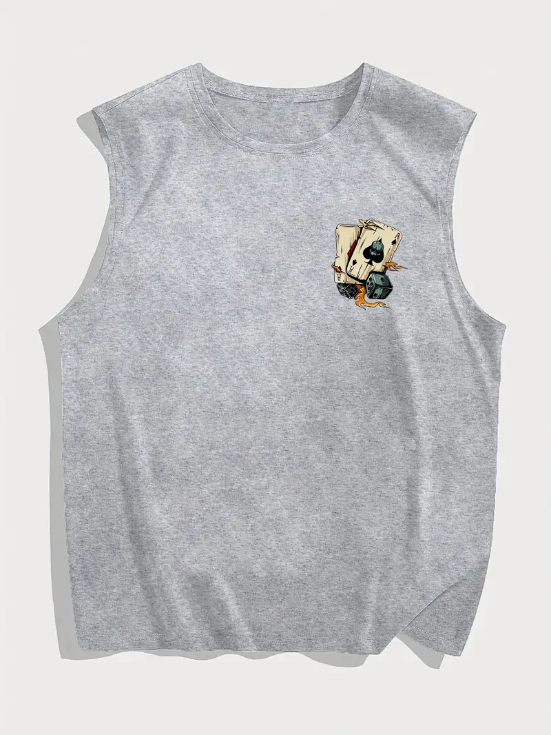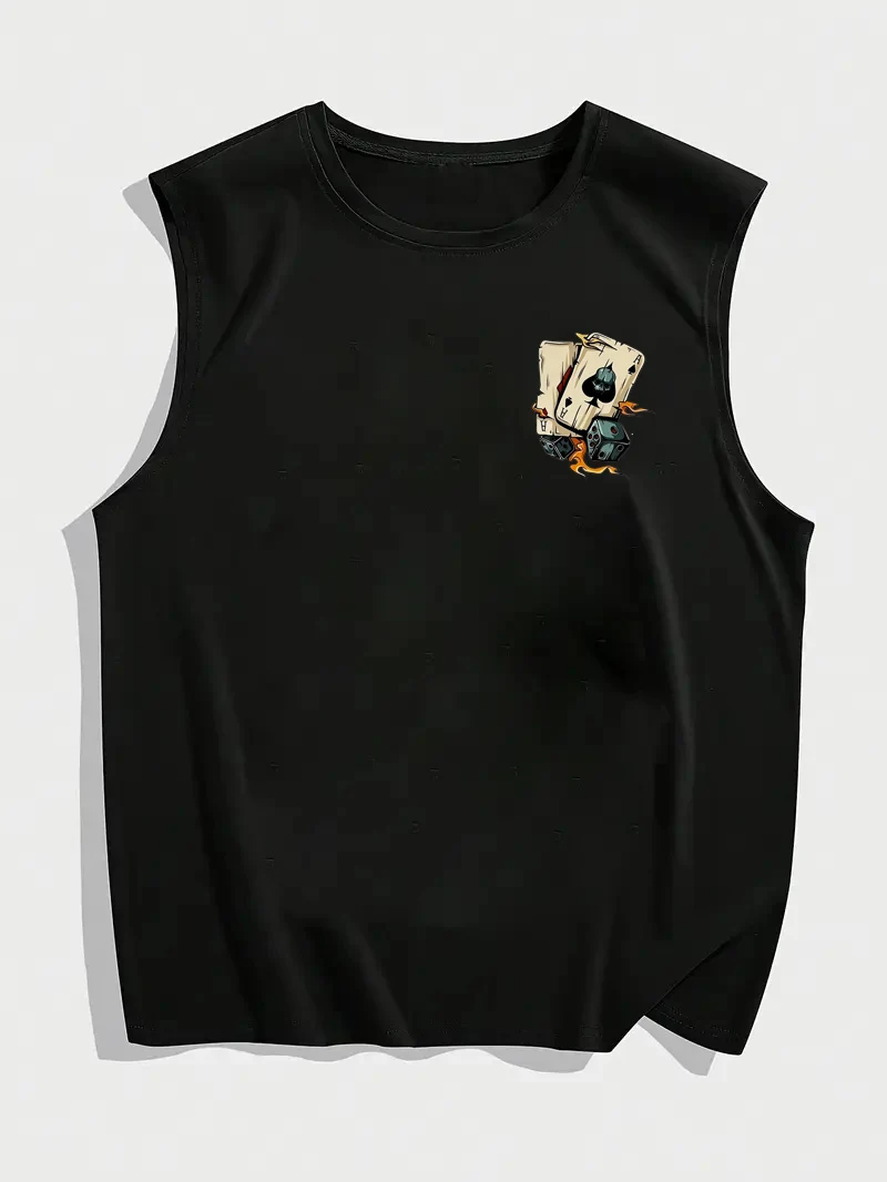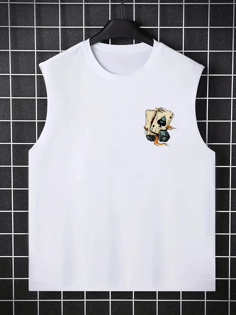 قميص رجالي صيفي للترفيه والرياضة واللياقة البدنية فضفاض مطبوع عليه نرد وبوكر مريح وجيد التهوية ورقبة دائرية بدون أكمام