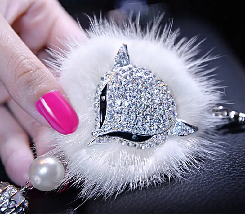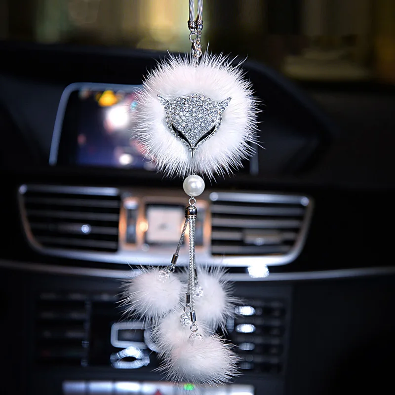 كريستال بلينغ الثعلب أفخم قلادة للسيارة ، كرات ذيل الفراء ، سيارة الديكور الداخلي ، مرآة الرؤية الخلفية زخرفة ، هدية عيد ميلاد للأصدقاء