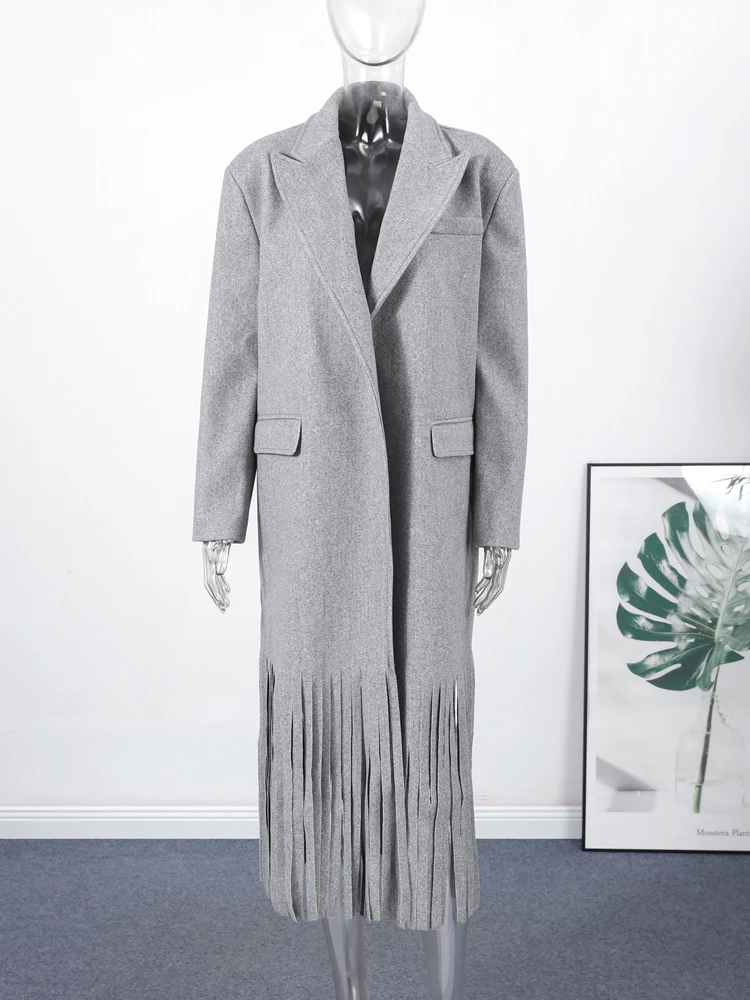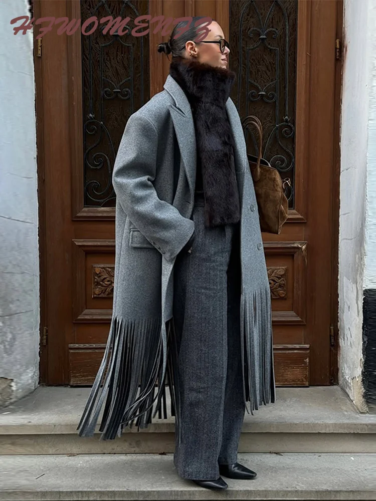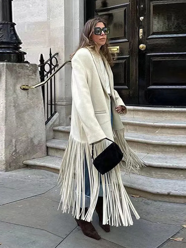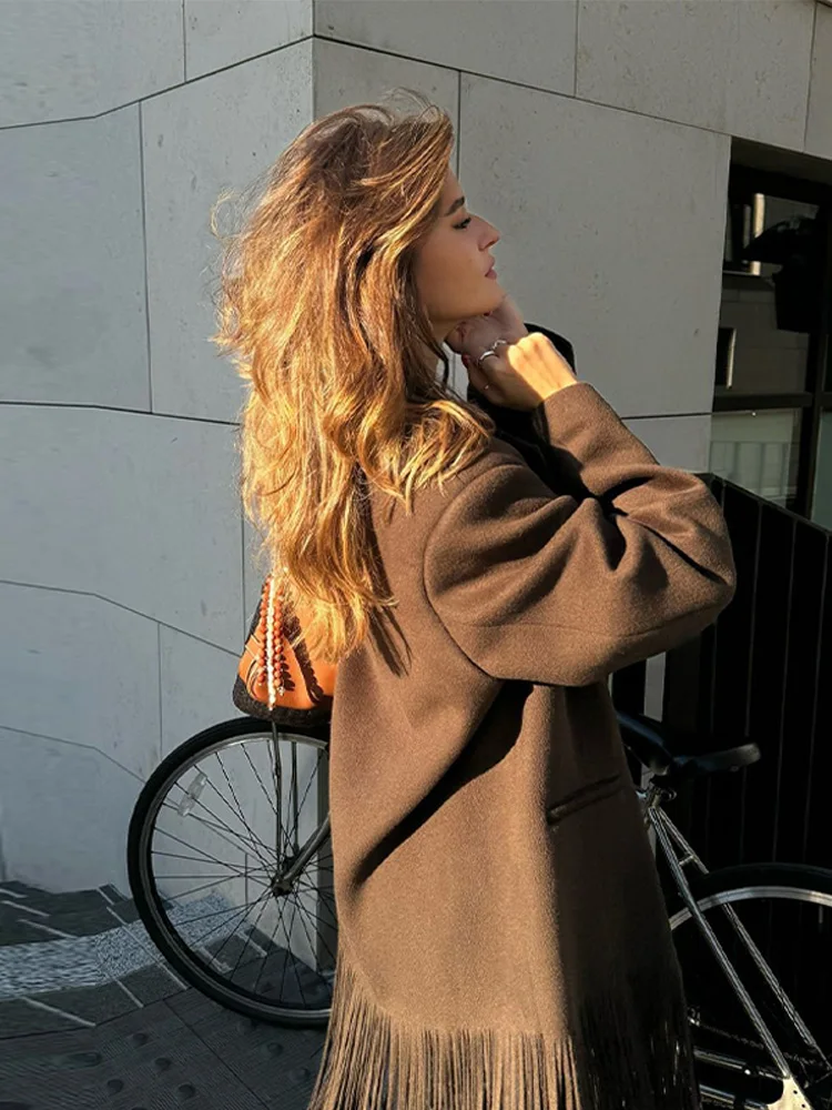 معاطف صوفية طويلة أنيقة بشراشيب للنساء فضفاضة وفتحة رقبة على شكل حرف v أكمام طويلة سترات خارجية أنيقة لخريف للشارع