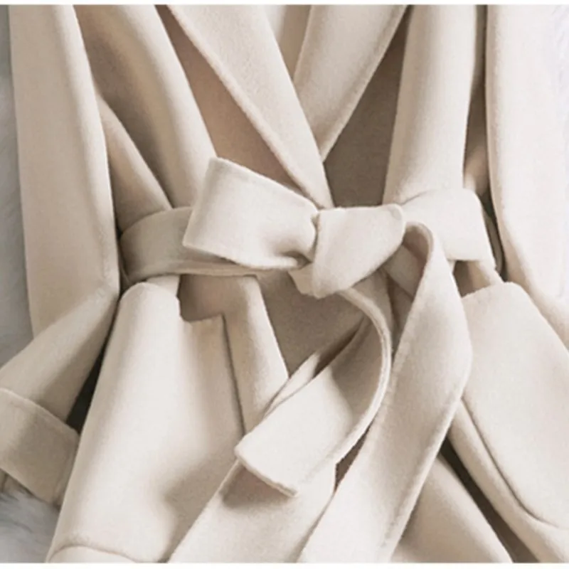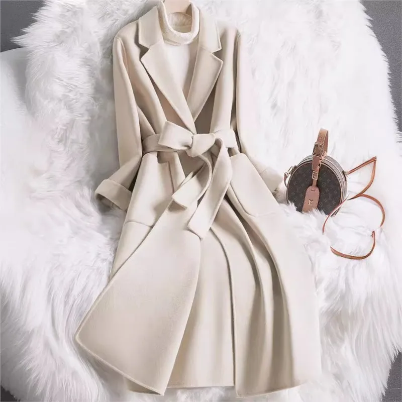 معطف صوفي نسائي ياباني وكوري للخريف والشتاء بتصميم جديد باللون البيج بقصة ضيقة للنساء