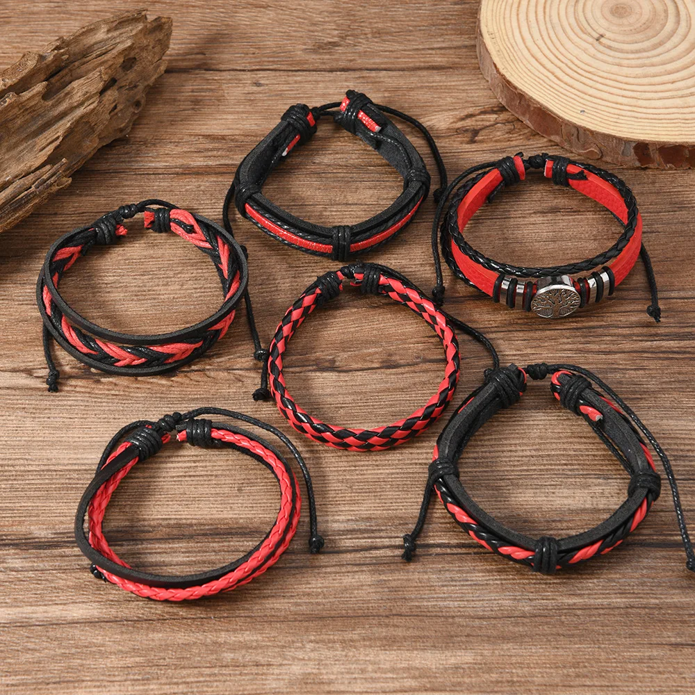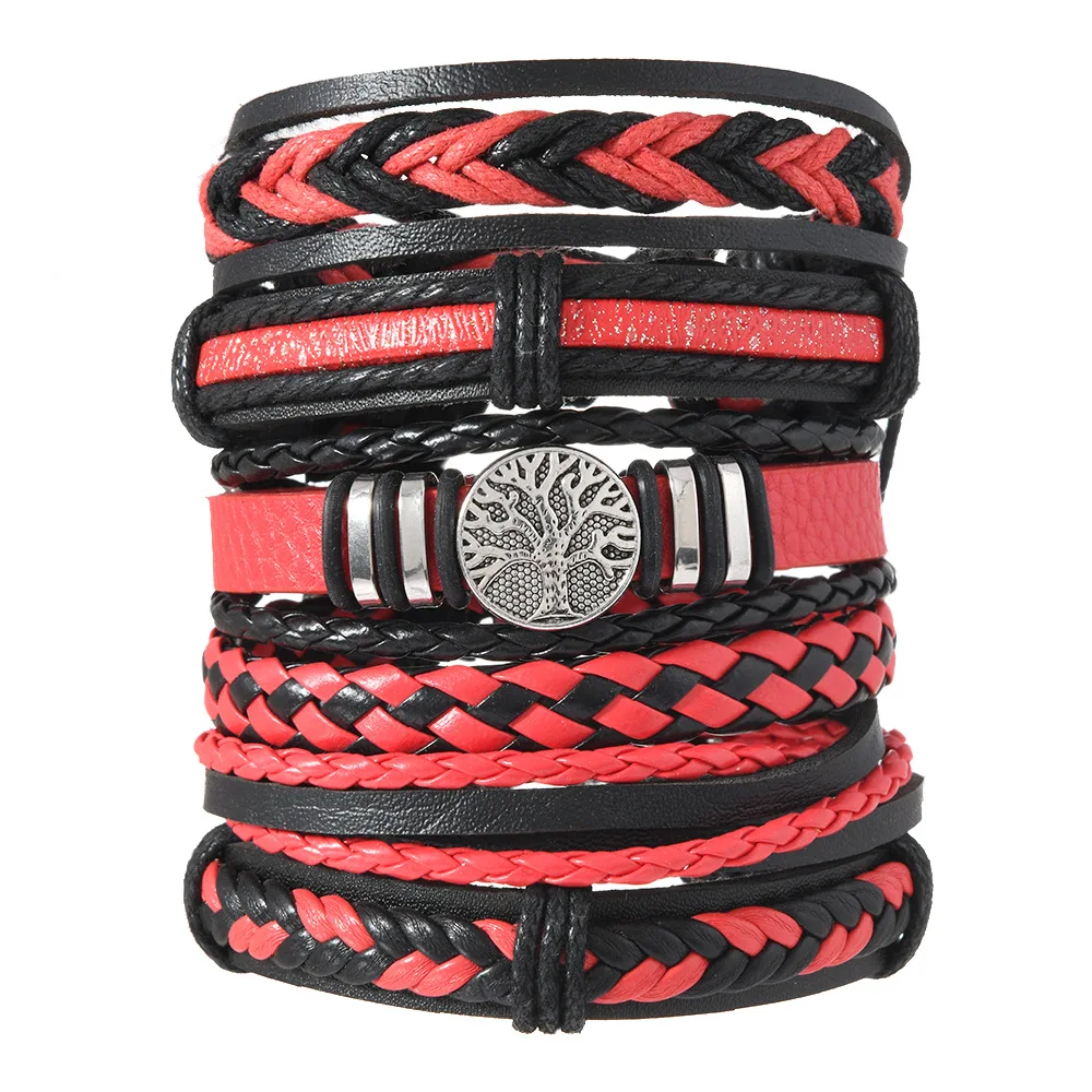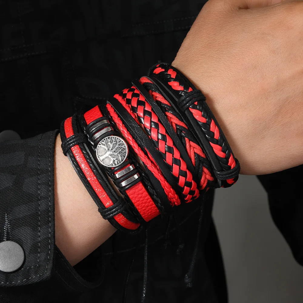 مجموعة أساور عصرية مكونة من ست قطع من شجرة الحياة للرجال مصنوعة يدويًا من الجلد على الطراز القوطي وإكسسوارات الدروع متعددة الطبقات