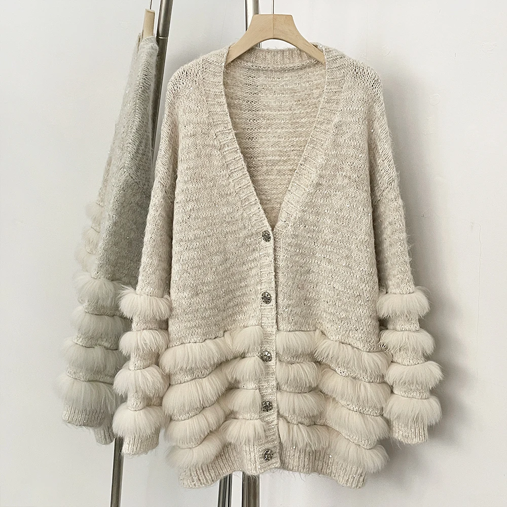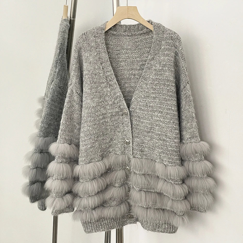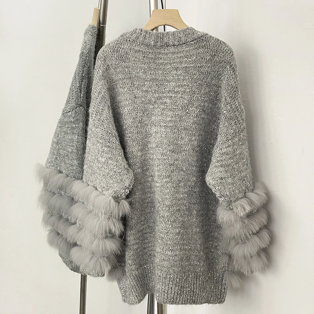 OFTBUY ريال فوكس الفراء زر سترة البلوز سترة الإناث جديد ربيع الخريف محبوك ملابس النساء فضفاضة كبيرة الحجم تريكو معطف