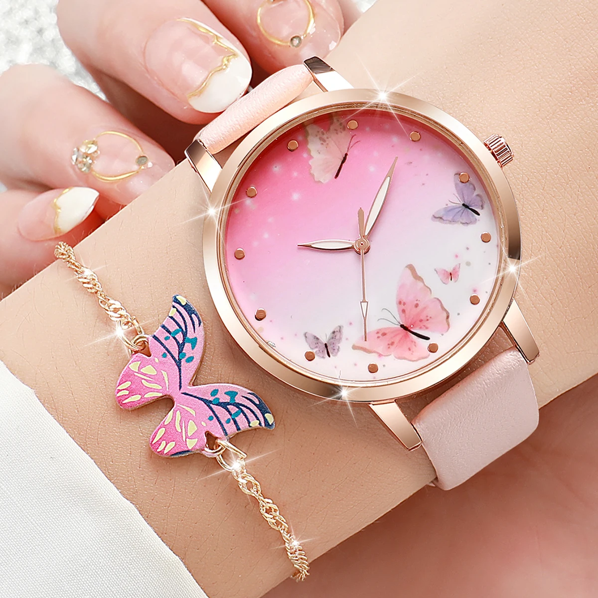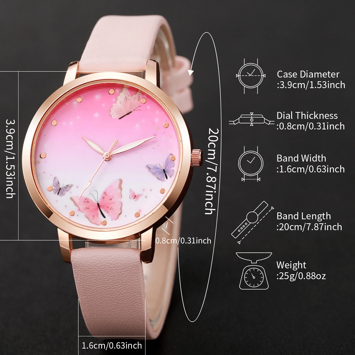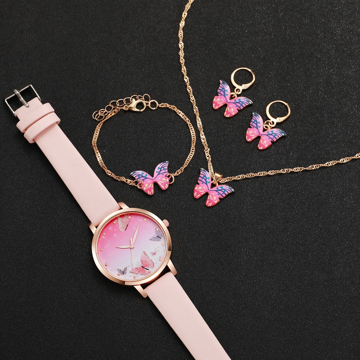 ساعة كوارتز بسوار جلدي للنساء ، ساعات بقرص فراشة ، طقم مجوهرات بدون صندوق ، 5 من كل مجموعة
