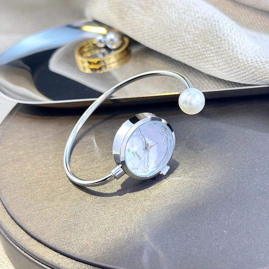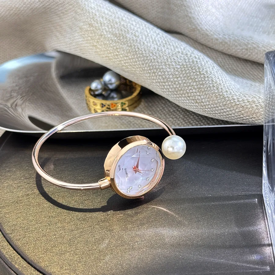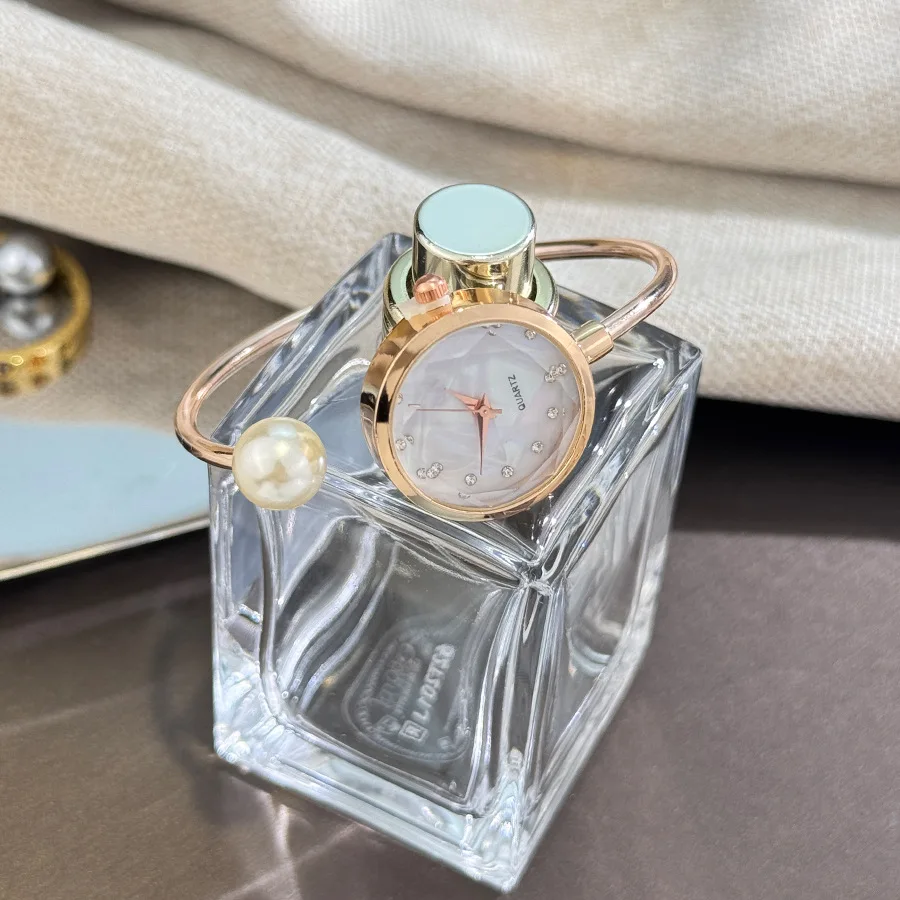 ساعة يد نسائية فاخرة بمينا صغير باللون الذهبي الوردي مع تصميم علامة تجارية من حجر الراين وساعة يد كوارتز للسيدات من اللؤلؤ المقلد