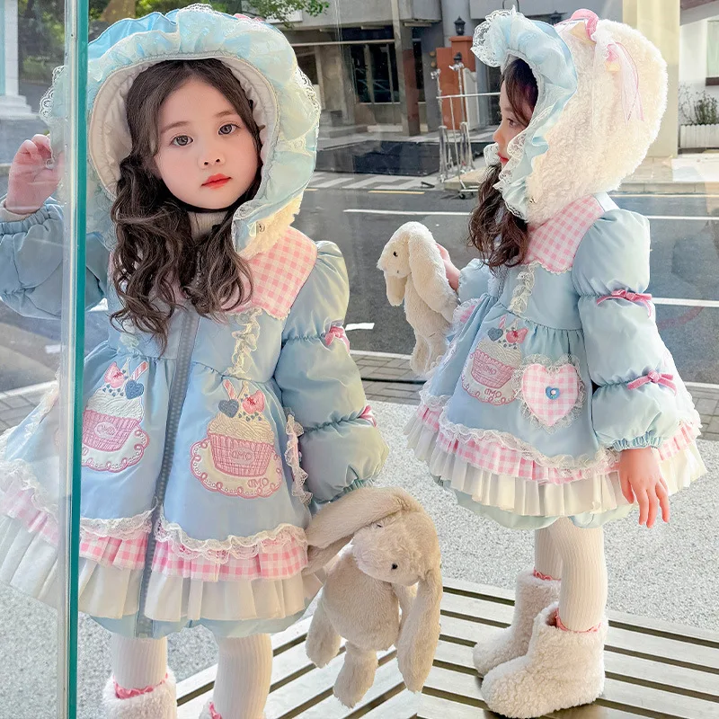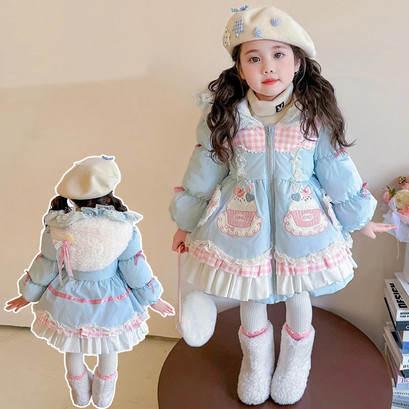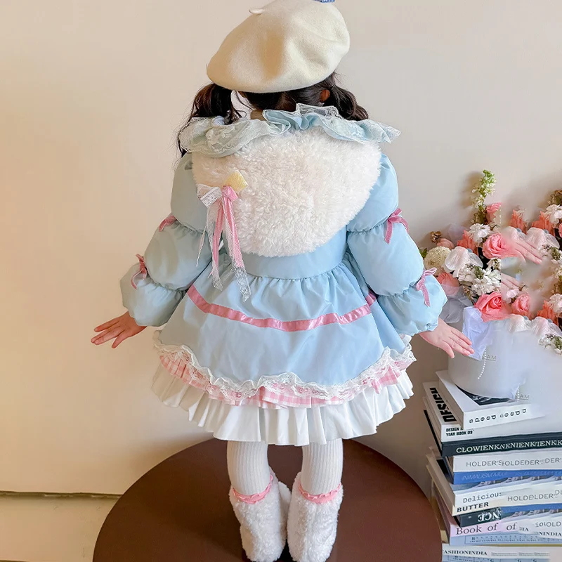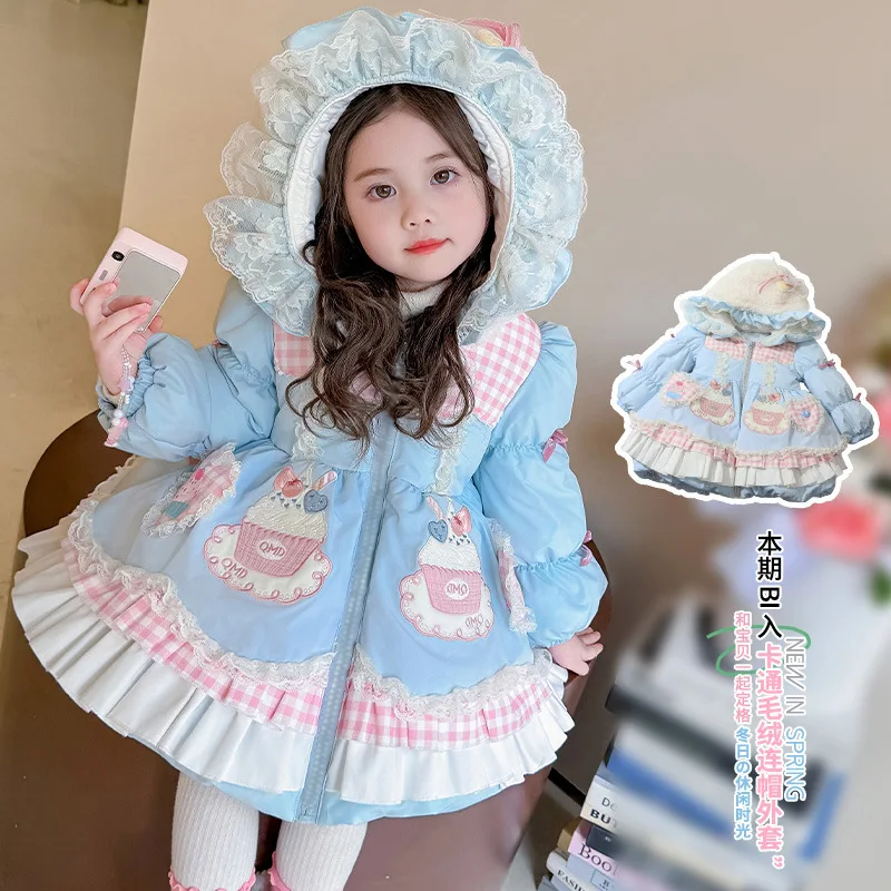 سترة قطنية لوليتا للفتيات الكرتونية سترة شتوية للأطفال سميكة ودافئة وعصرية بقلنسوة مزينة بفيونكة سترة قطنية حلوة