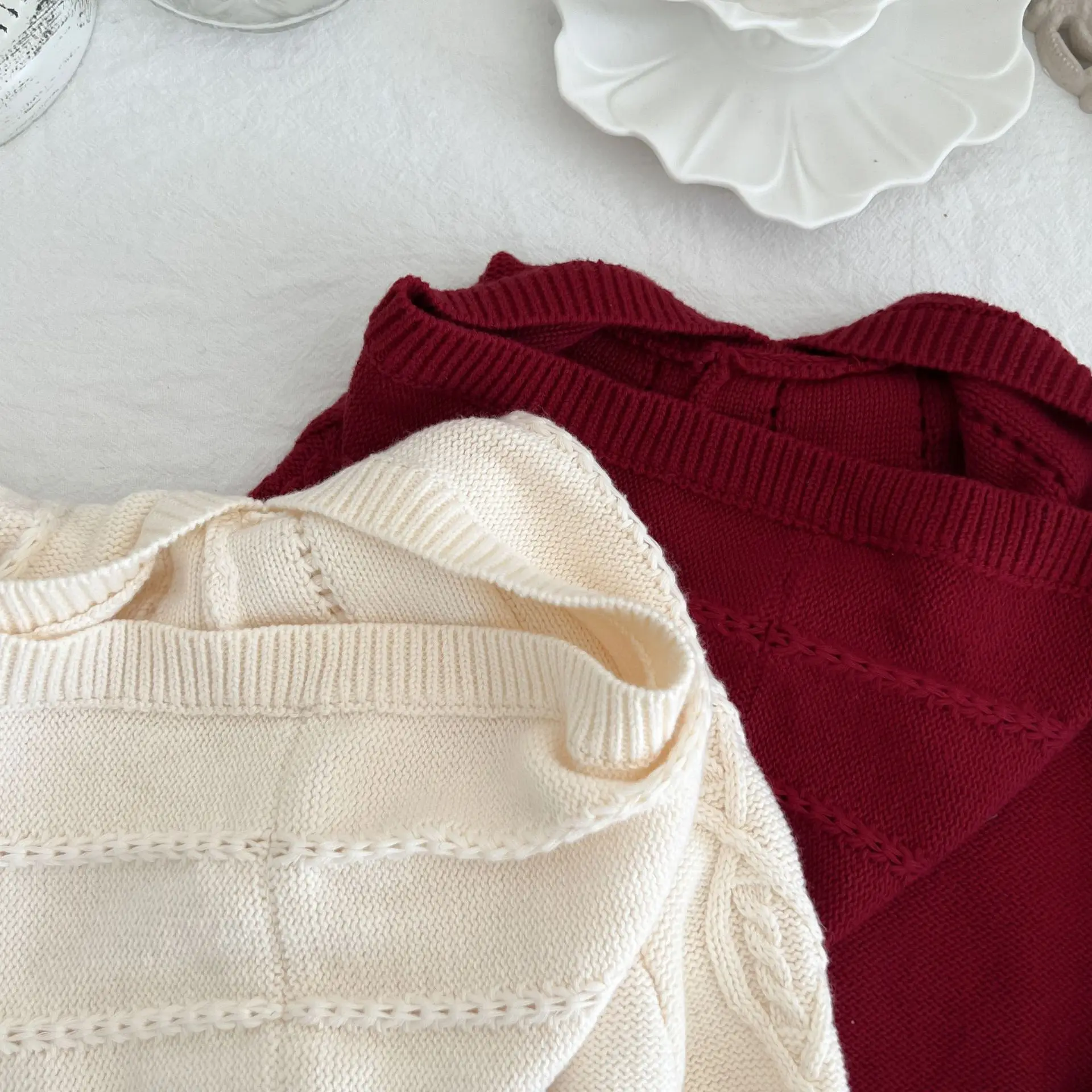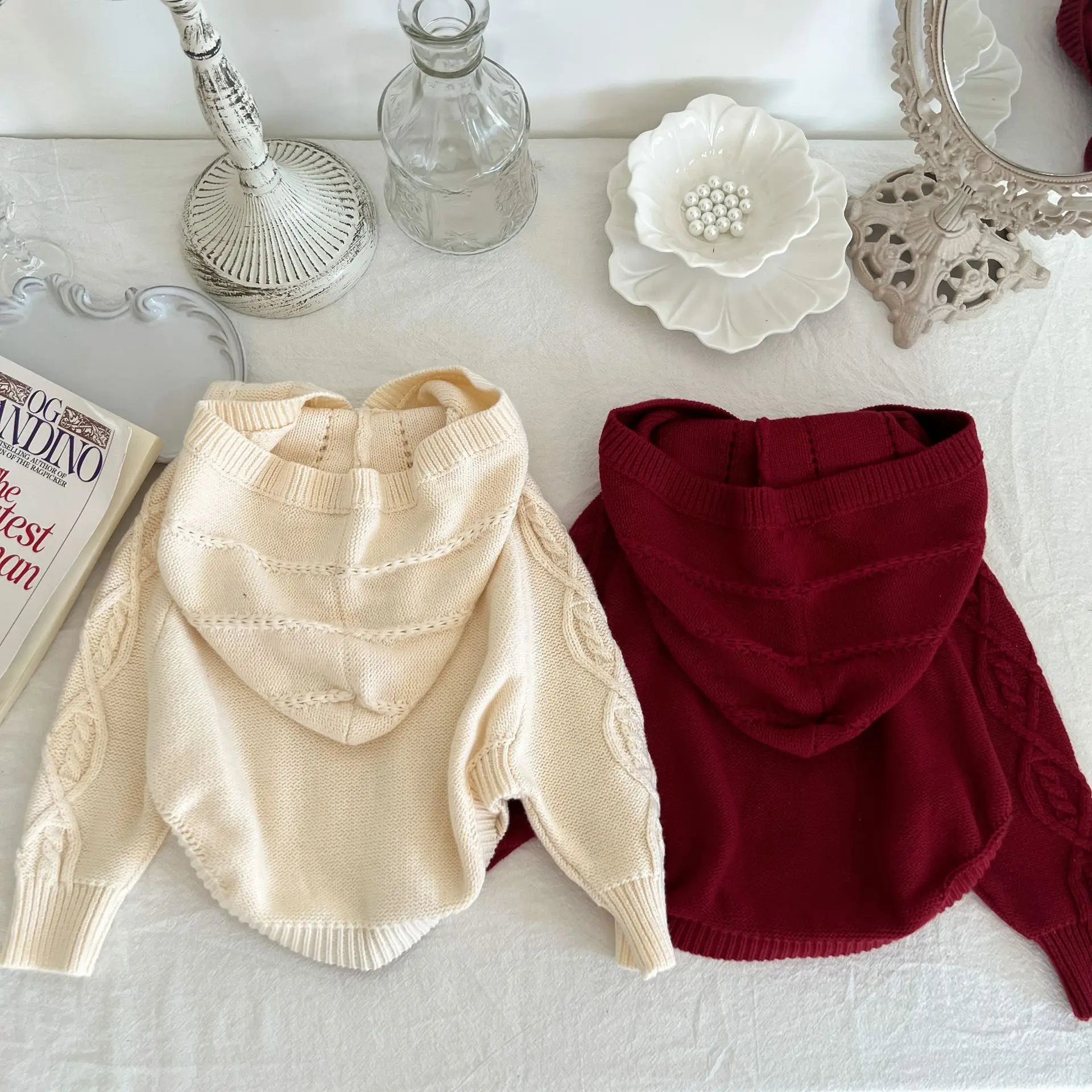 سترة محبوكة بغطاء للرأس للأطفال والرضع والرضع والرأس للبنات الرضع والأحمر والبيج ، بلوفر عصري ، نمط داخلي ، الربيع والخريف