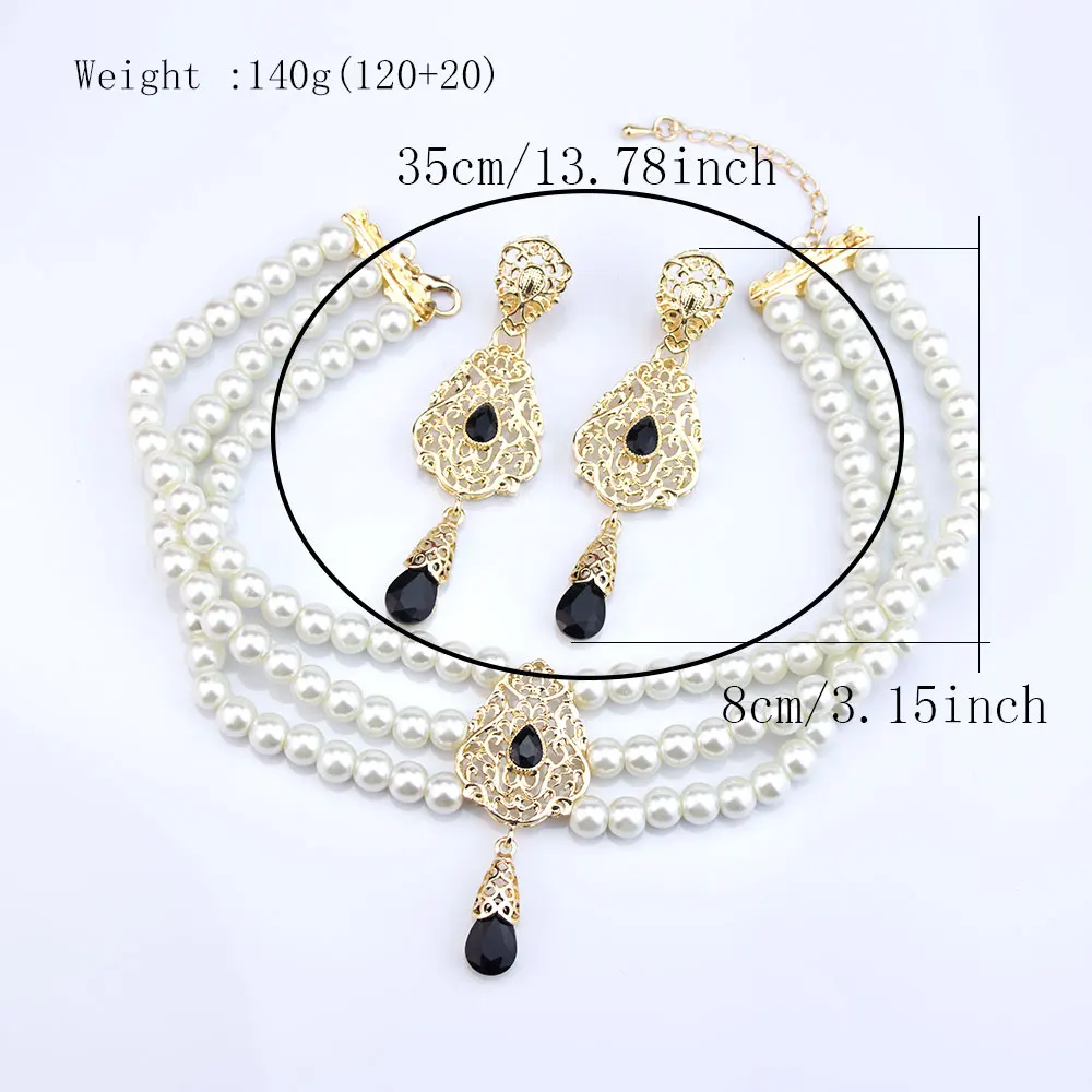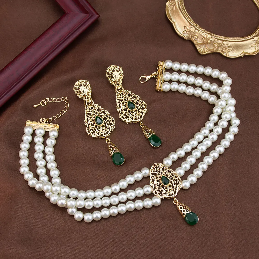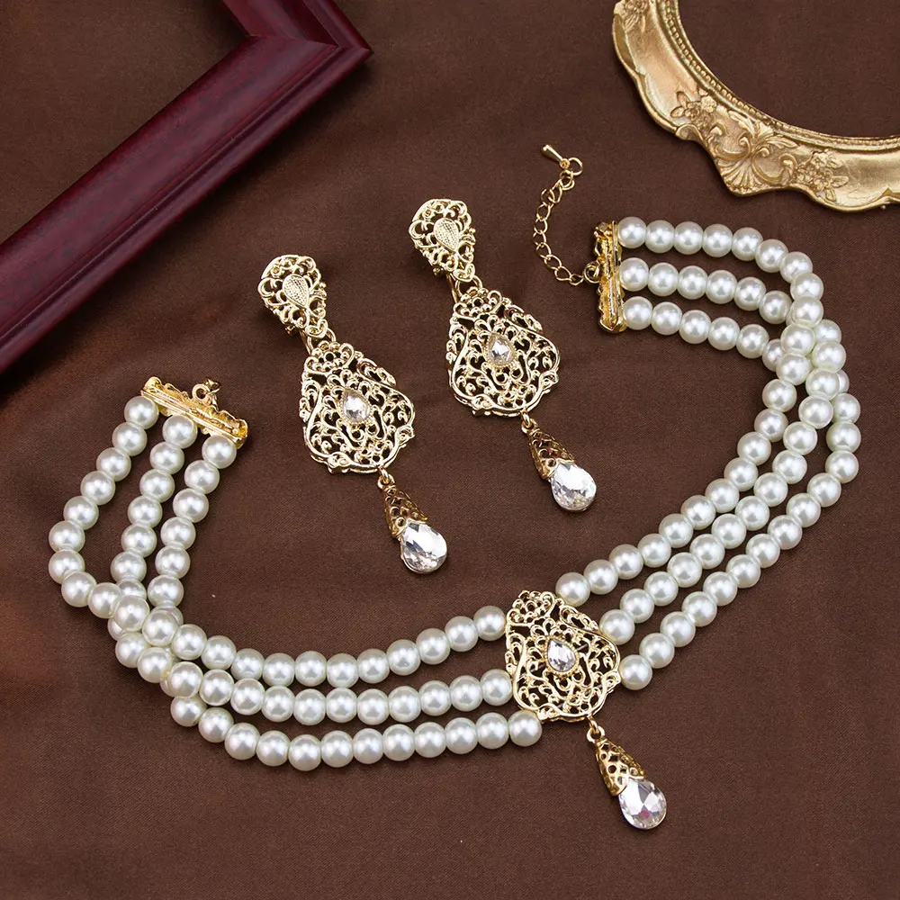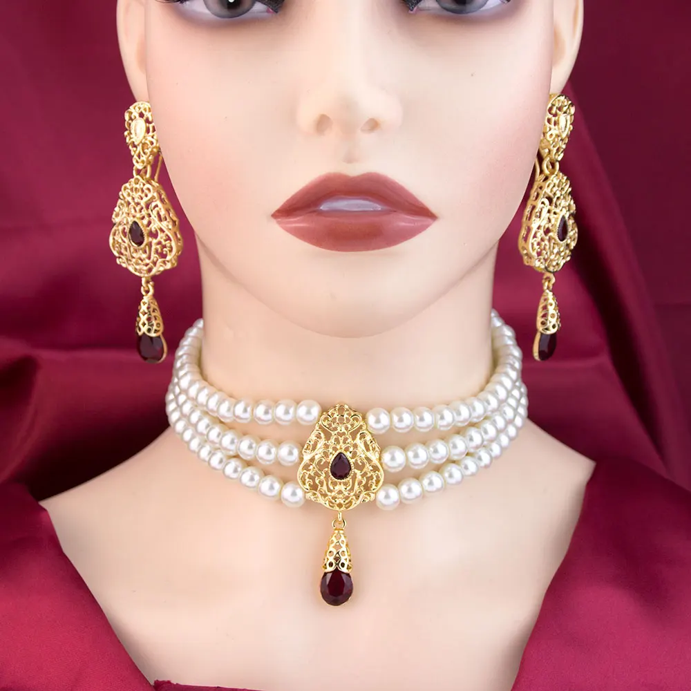 Sunspicems شيك المغرب مجموعة مجوهرات الزفاف القرط حبة اللؤلؤ المختنق قلادة الذهب اللون العربية سلسلة عنق بيجو