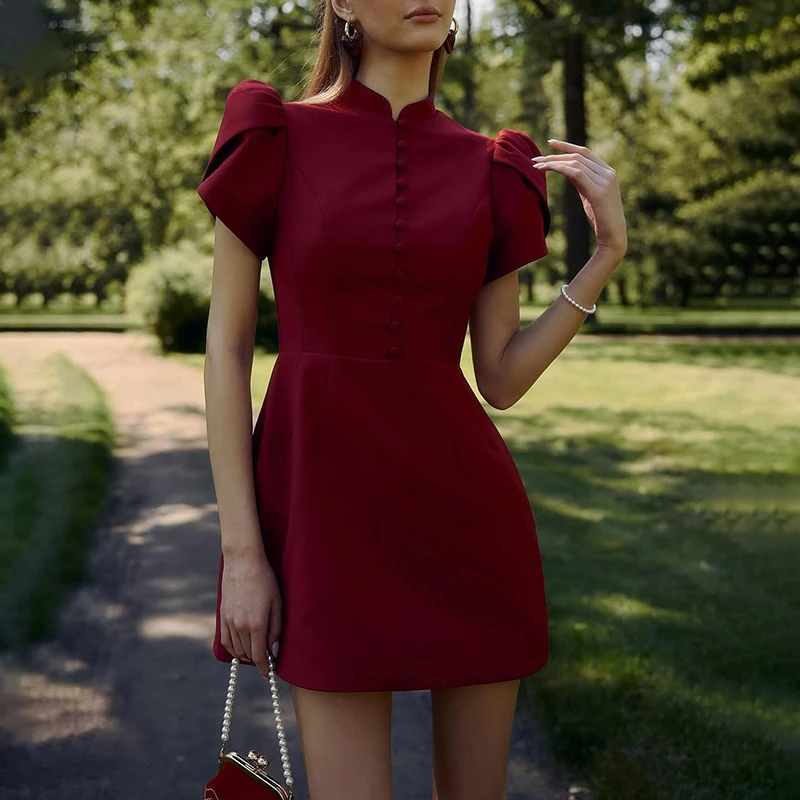 Ticketsx نفخة الأكمام فستان قصير المرأة الوقوف طوق الغناء الصدر الخصر مقصوص فستان أنيق الإناث مساء حفلة فستان نحيل