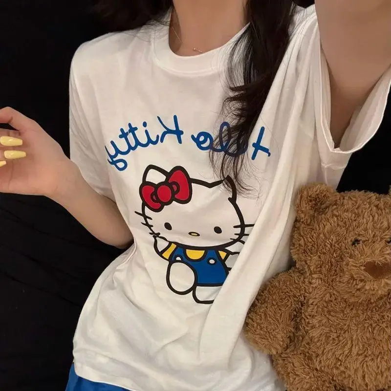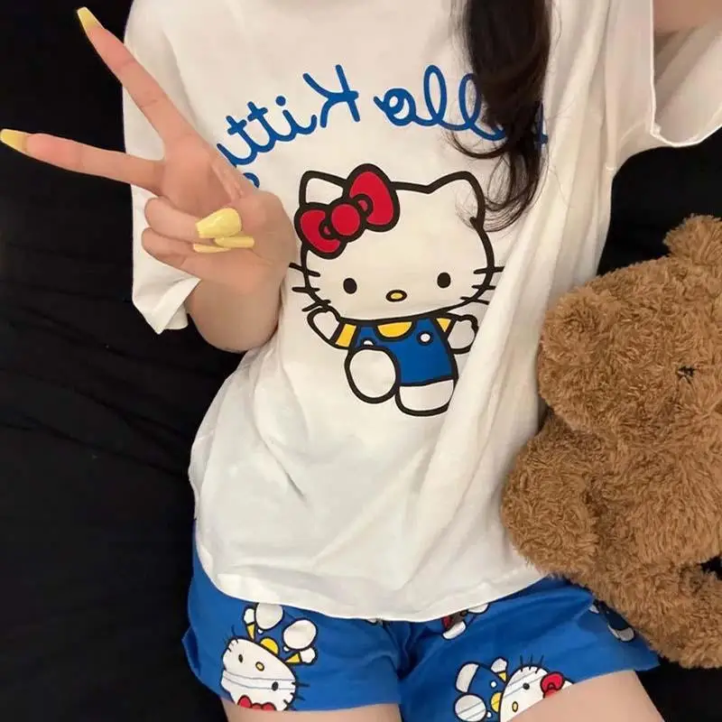 طقم بيجامات هالو كيتي ملابس منزلية طقم مكون من قطعتين مريح كاواي Y2K فضفاض من القطن الخالص بأكمام قصيرة
