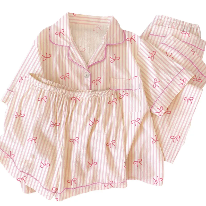 طقم بيجامات نسائي صيفي مكون من ثلاث قطع ملابس نوم ترفيهية بأكمام قصيرة وطية صدر السترة مع فيونكة حلوة مخططة مطبوعة ملابس منزلية ملابس تنحيف نسائية