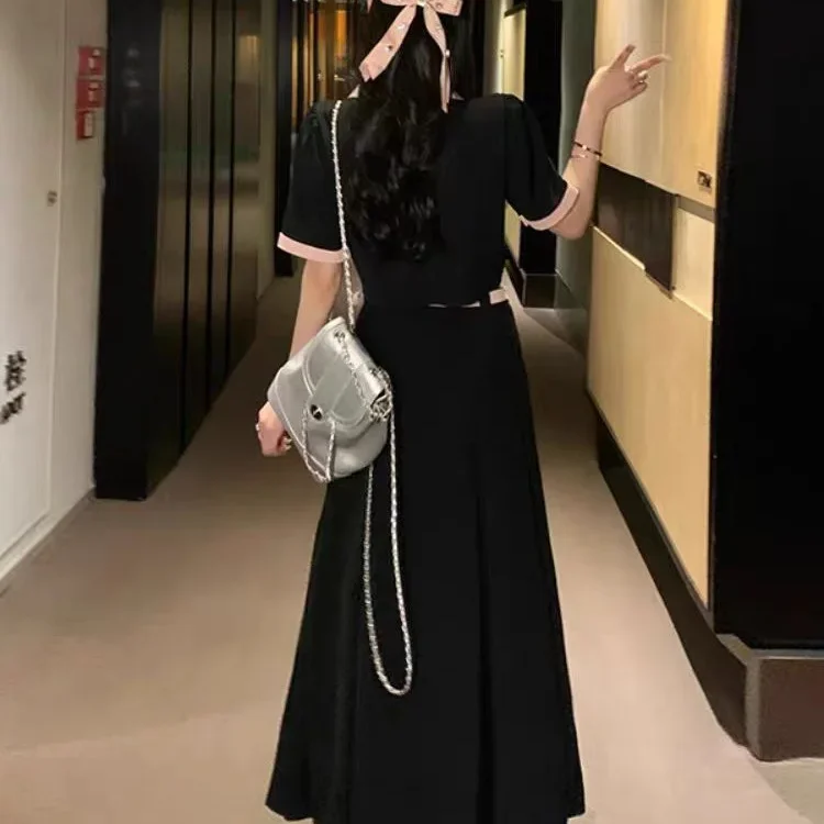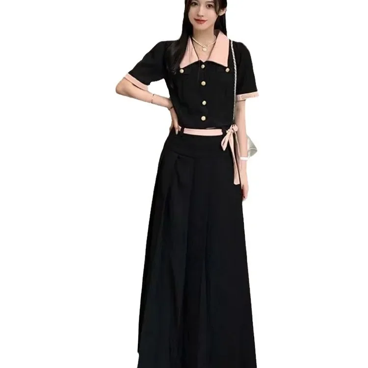 طقم تنورة طويلة سوداء مقاس كبير للنساء على شكل كمثرى صيفي بخصر عالٍ للتخسيس نصف الجسم طقم مكون من قطعتين من ألياف البوليستر